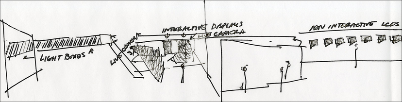 The installation transformed movement in real time, using a unique system architecture that combined movement-centric parameters to extract the perceptual features of motion from video. Human traffic created and continually reshaped the form and flow of the display.