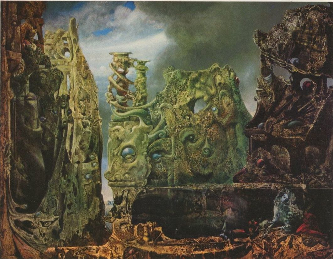Max Ernst in particular developed several techniques such as frottage (placing paper over an uneven surface and producing a “rubbing” with a pencil) and decalcomania (pressing layers of paint against the canvas with glass or some other suitable material), to generate, while excluding all conscious mental influences, a suitably rich substrate from which an image would then be “hallucinated” by a process of free association directed towards making the unconscious visible. This is a more highly evolved version of the common phenomenon of pareidolia, in which our overdeveloped pattern-recognition abilities cause us to “see” images, and especially faces, in inanimate objects such as buildings or bathroom fittings or slices of toast. While Ernst himself didn’t speak of his work in terms of improvisation, it’s clear that much of it is concerned with using various more or less unusual techniques to create the conditions for spontaneous flights of the imagination.