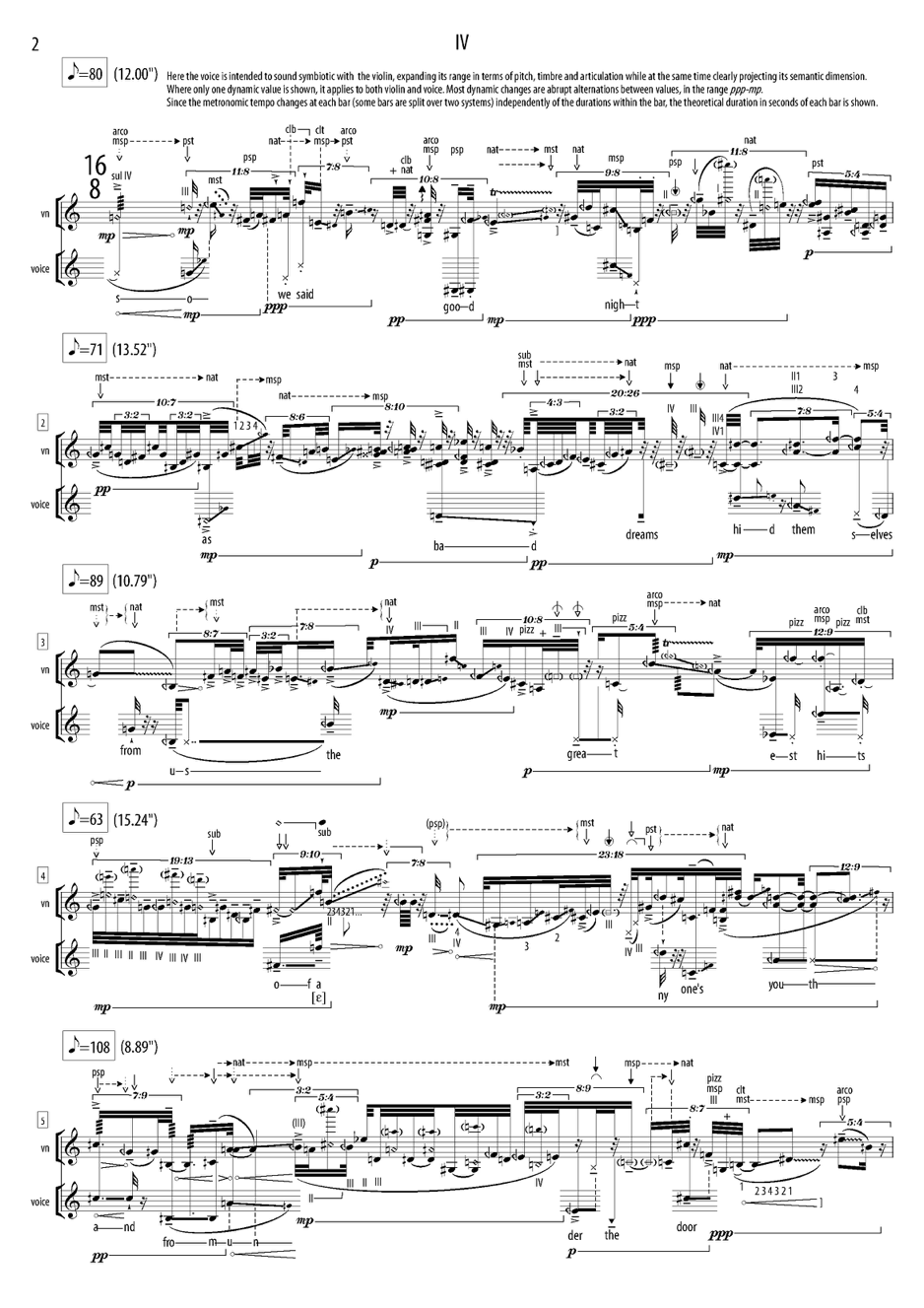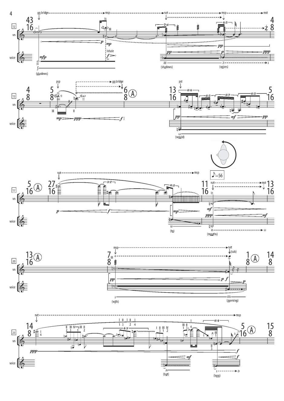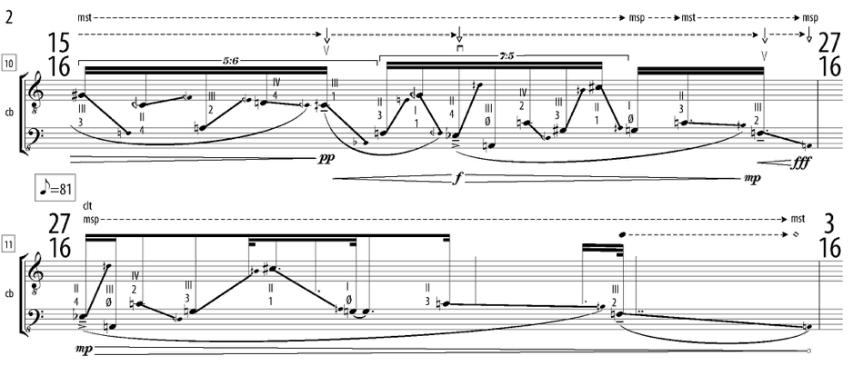 (d) Material based on bar 4 of abyss [another component of life-form], concentrating on the 9/8 bar below the main one (complex textures of harmonics, movement between normal and molto sul ponticello bow position, pauses), starting with the stated tuning and not changing it (since your LH will be busy with the harmonics!). 2 minutes of this material will suffice.
