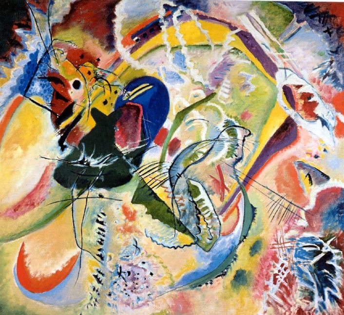 When looking at what the visual arts might have to offer in terms of ideas that would “translate” into concepts applicable to musical improvisation, I thought it seemed appropriate to begin with the work of Wassily Kandinsky (1866-1944), since he made his celebrated transition from figurative towards abstract art principally through a long series of over 200 paintings made between 1909 and 1917, which he entitled Improvisations.