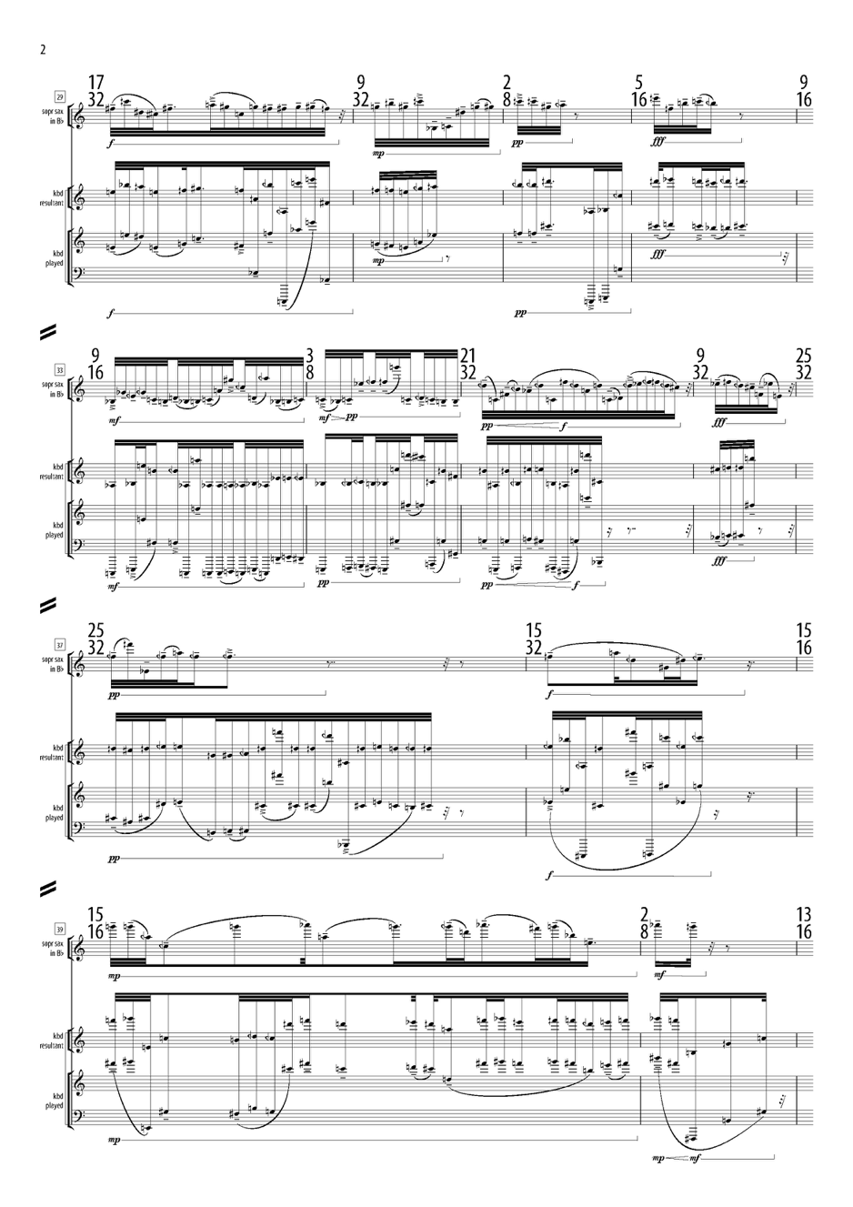 One possible way of discovering new directions in musical composition is to begin by conceiving or reconceiving compositional techniques (something that is of course facilitated in a context of systematic methodologies). What I mean by “reconceiving” is translating some particular technique from one compositional field of activity to another. In the case of linear-A, it took shape through an application to notated music of the “random collage” technique use in Dysnomia and Nephilim from binary systems, as well as other earlier fixed-media compositions. The decision to take this approach wasn’t made arbitrarily, but emerged from the initial ideas that motivated this piece. Its title refers to an early writing system developed in the Minoan civilisation some time after 2000 BCE, which (unlike the later Linear B) has not yet been deciphered. Many of its symbols are relatively complex and have a representational “hieroglyphic” character, while others look much more like Greek or Latin letters. I imagined a composition made up of more or less complex “sonoglyphs”, each consisting of between one and ten notes spread over a more or less wide pitch-range, and assembled into a structure that would oscillate between presenting them as discrete musical units and superimposing them to the point where they lose their individuality – in fact the music involves an overall tendency to evolve from the first to the second of these. I began with the intention of composing the “sonoglyphs” and then arranging them spontaneously (but incorporating them in an order determined by a random number sequence), but, once they’d been composed – 150 in number, deriving from the same pitch matrix as used in other PSYCHE components, consisting so far only of pitch sequences – I found it impossible to settle on a satisfactory way of doing this. Therefore, the spontaneous method of superimposing and concatenating the sound elements of a fixed media collage was replaced by a much more deterministic one. First, a sequence of durational units was constructed for the two minutes of the piece (180 beats at 90 bpm). This consisted of two “voices”, one containing 60 units whose durations gradually diverge from 6 16th-notes towards a range between 1 and 18 16th notes, and the other containing 72 units whose durations gradually diverge from 5 16ths towards a range between 1 and 15. At the outset each voice consists of a sequence of units placed end to end, and each evolves towards a range between units separated in time and units overlapping for almost their entire durations. Thus some moments consist of only a single line, while one involves a maximum of 12 overlapping parts. Each unit was assigned a “tempo” (using whole-number ratios), and then each was assigned a “sonoglyph”, using up 132 of these – the remaining 18 were then incorporated in the form of grace-notes added to the rhythmical structure. While this kind of process was developed in the studio as a way of bringing spontaneity into working with highly varied sound elements in a fixed media context, in the context of notation it became time consuming and rather laborious, paradoxically because the simplicity of the materials (that is to say, pitches and durations) shifted the centre of gravity of the composition process, so to speak, from the sound-generation stage to the assembly stage – since, for example, once all the pitches were in place a further redactive level of “processing” was required in order to create consistency (rather than arbitrary relationships) within the complex pitch-fields of which the collage consists. Nevertheless the result of this experiment was a music which I don’t think could have come about using other means. While beneath its surface it retains the quality of being “about improvisation”, spontaneity in the composition process was largely submerged in the meticulous work required to notate it, although at every point during that process it was possible for spontaneous decisions to be made. Here is page 2 of the score.