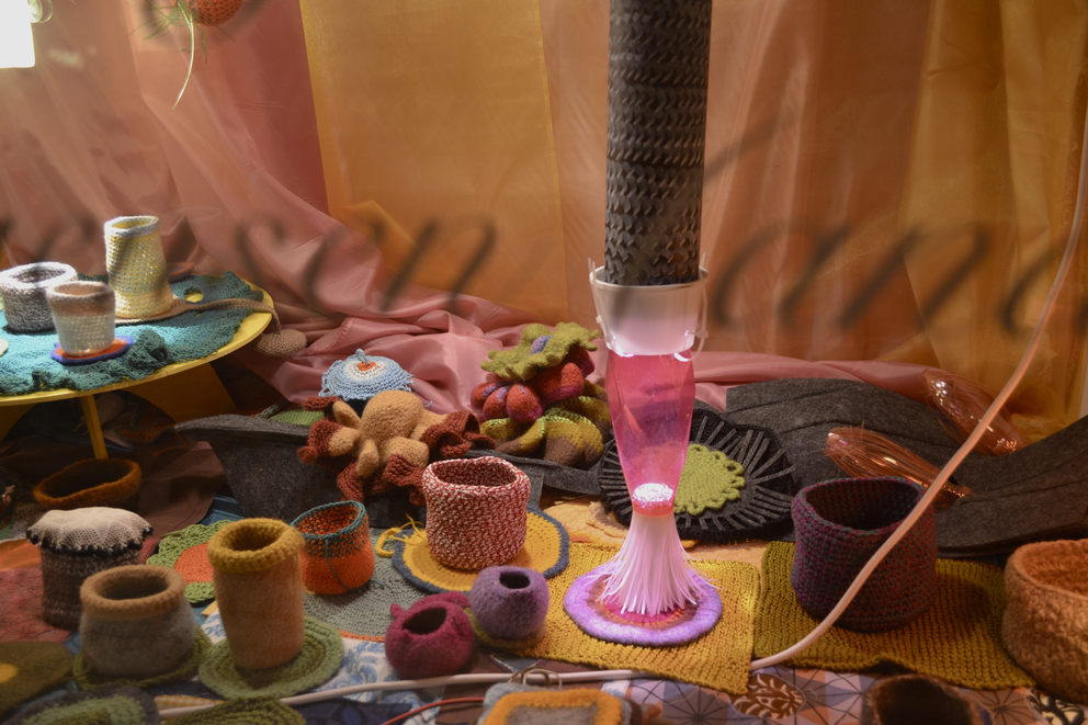Shown like this my work keys into the existing practice of window dressing. And though there is no competition, it does vie for attention with the other galleries, cafés and shops on this street. My window is like a shop window, like a seasonal Christmas or Easter display, it’s like a handicraft stall, yet it is none of these. Like them it is always accessible, but I also like to think that it is accessible in another sense. Having used easily available, lowly materials like fabric remnants, leftover plastic, yarn, bits of rope, I want to show that anyone can do this. The cut edges, visible stitches, cable ties and straightforward placement of objects on top of and next to one another demonstrate simple, everyday techniques. It is my attempt to show that when I make art (I consider the installation of work in this window part of my practice) it can be indistinguishable from non-art tasks like setting a table, mending a pair of shoes or hanging up fairy lights. However, one of the differences between ordinary tasks and making art is that art need not be useful in an everyday, practical or functional sense, but what it does do is allow me to ask questions – nonsensical or silly questions like “What if octopuses had gardens and they looked like this? What if octopuses made things, crocheted, stitched, glued and cobbled together strange objects or lamps from leftover plastic containers?