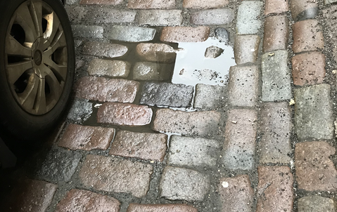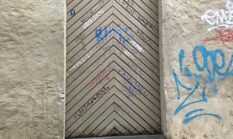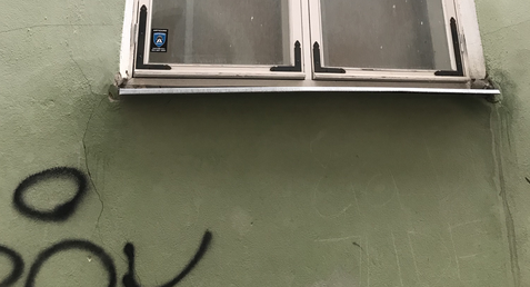 Not far from this restaurant is another art gallery.[37] There are spotlights aimed at clay mask-like pieces on the walls and at the far end of the gallery a well-lit wall and floor section of clay. In front of this stands a camera on a tripod. I think someone is making a film of the drying clay. I am a witness to process art. I keep walking. Around the corner there is a café with a bench and purple cushions squashed up against the window. I take a photo and then notice my own reflection on the glass. I watch it as I move back and forth changing the composition of the reflected image. The waiter was a performer in the restaurant and now here I am, also a performer or maybe a participant in participatory art.