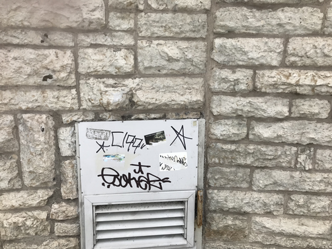 I continue walking. Hobusepea Gallery has an exhibition with minimalist grey and white paintings on the walls.[26] This exhibition doesn’t communicate directly with the viewer on the street and even though the paintings are spot-lit I feel like someone with a bad seat in a theatre, where I can’t see the stage head-on. This gallery has a downstairs exhibition space in the cellar but the blind in front of the only window that provides a view down into the cellar space is drawn and all I can do is imagine what the work down there looks like. A couple of doors down at HOP Gallery the exhibition is a slide show that faces directly towards the street.[27] It’s clearly visible and the voiceover coming from a speaker directed into the street is audible. The slide show with its richly contrasting black and white photographs of such things as a merry-go-round, a decorative sculpture in a well-tended garden and the sky with bits of trees peeking into the frame, is set deep in the space, thus turning the black box of the gallery into part of the work.