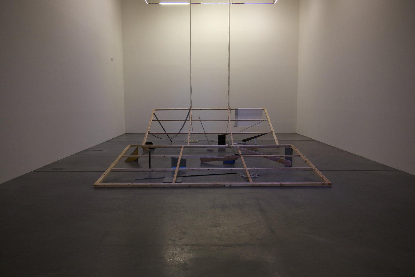 Having done these experiments, among other wanderings in the field, I also started to work with the museum leftover materials (kept from exhibition dispositive that have no more use). These leftovers consist mainly of wood pieces in variant shapes and sizes. I projected two grids that served as open plans once I was suspending them by robes or by using other objects to serve as wedges.