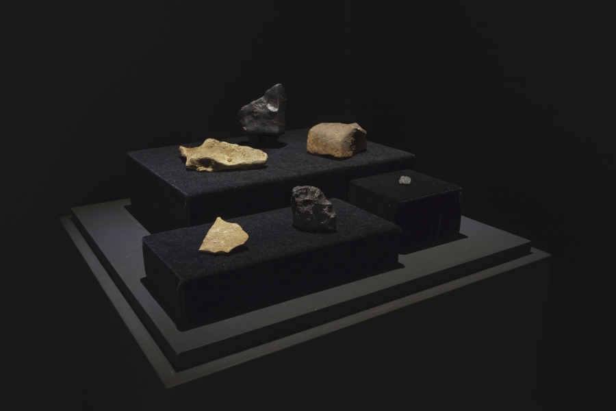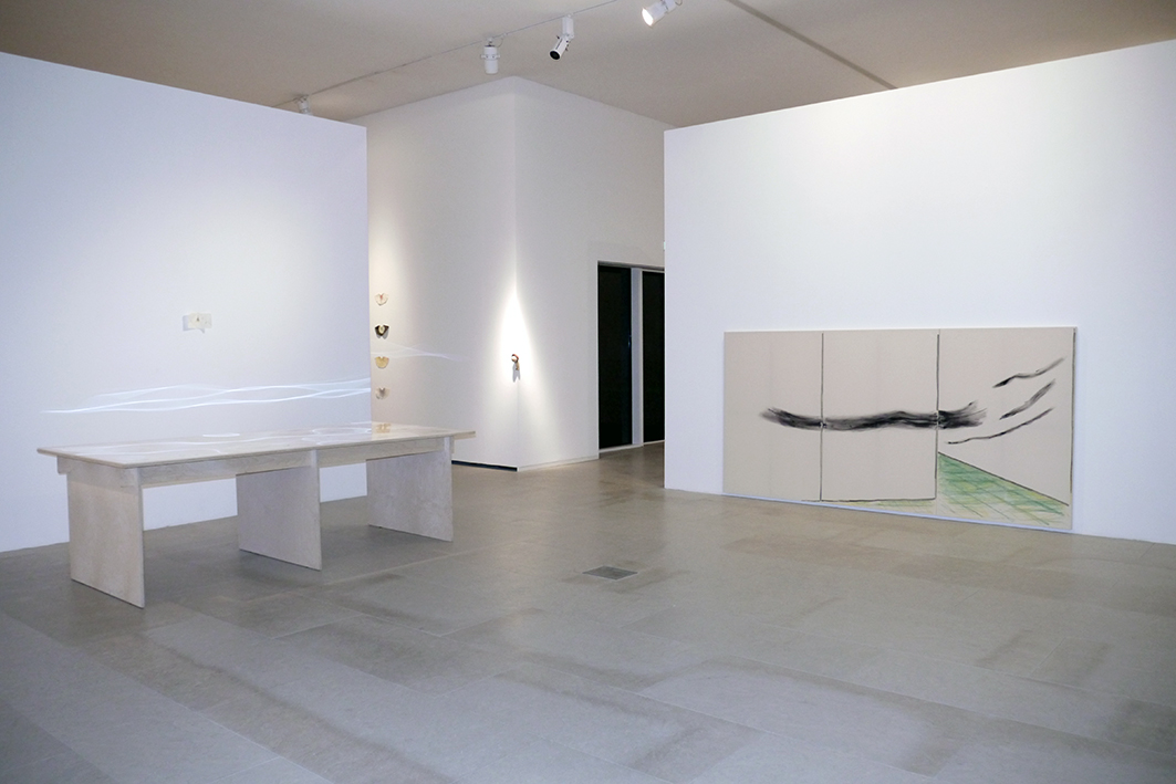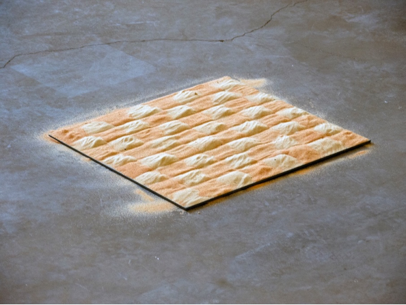 To reactivate the desert insights, I decided to use the materials that I collected in the desert, as a kind of archaeological artefacts, which were just found and unveiled, with a supplementary and emancipatory gesture on it. I can’t avoid to work within place and time, therefore this enacted situation had to be moulded by the new location. I wanted to exhibited these pieces, not by disposing them, but as if they were just released, freely occupying this new place, without order, filling it the new challenging boundaries and clearly adapting to it, as it is evident they don’t originally belong there.