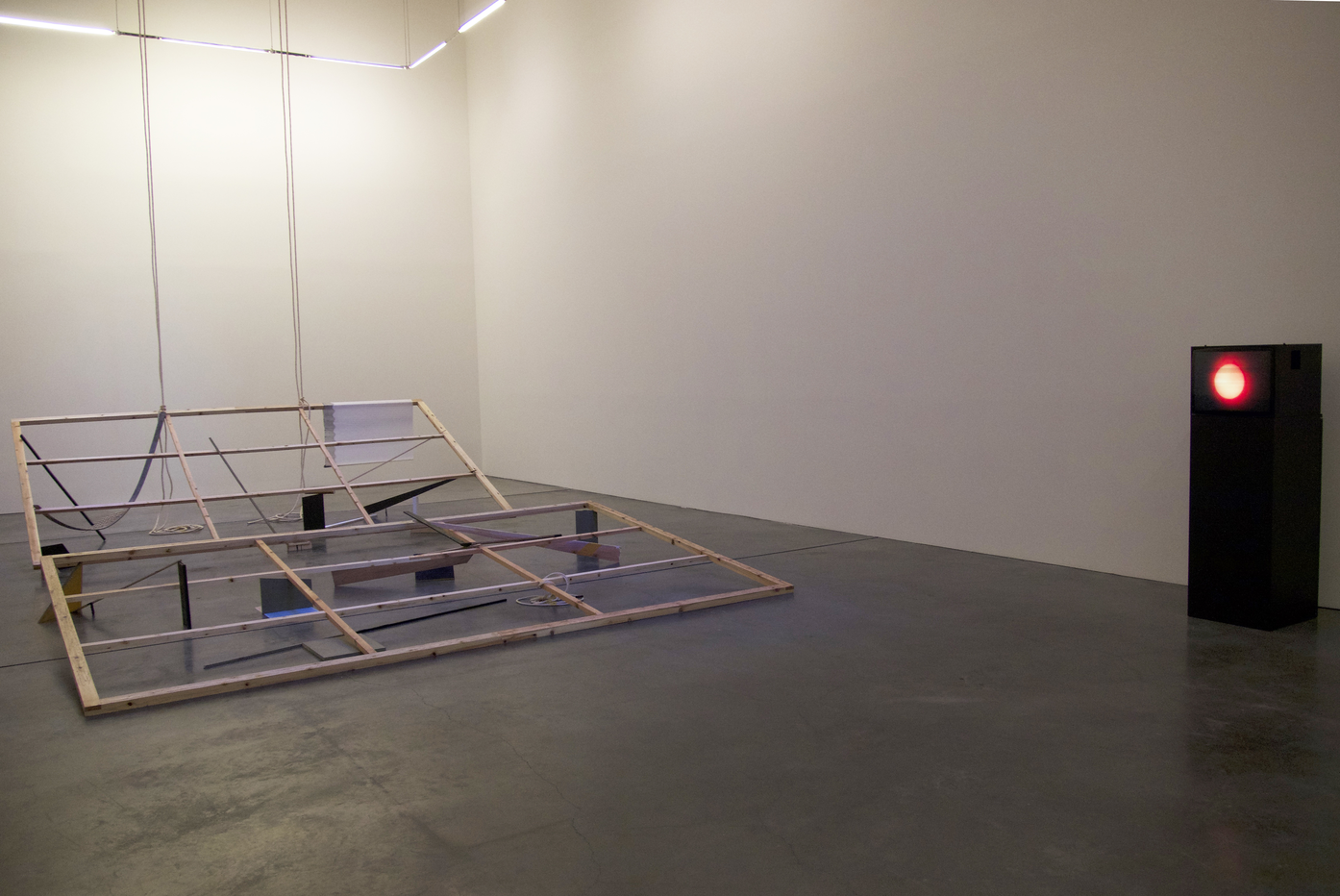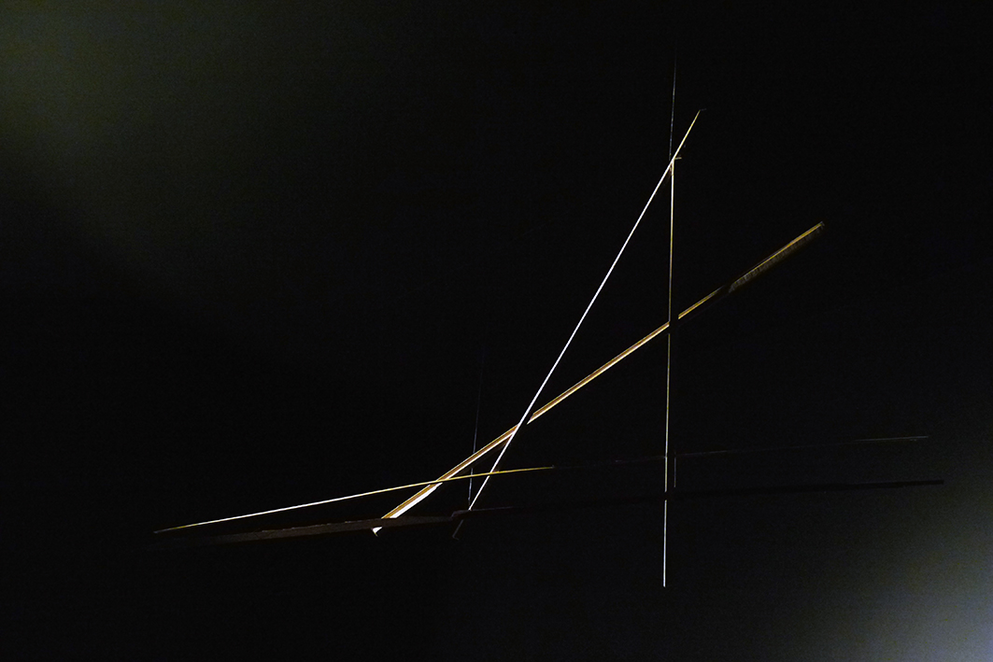 Évènement, the drawing upright the installation scene, is schematic of the mirage effect to which we have access from the sunlight refraction caused by the earth curvature and the trembling horizon caused by temperature differentiations - the last segment of sun sighted is no longer there, it is its doubled image – a possibility for the green ray dispersion.