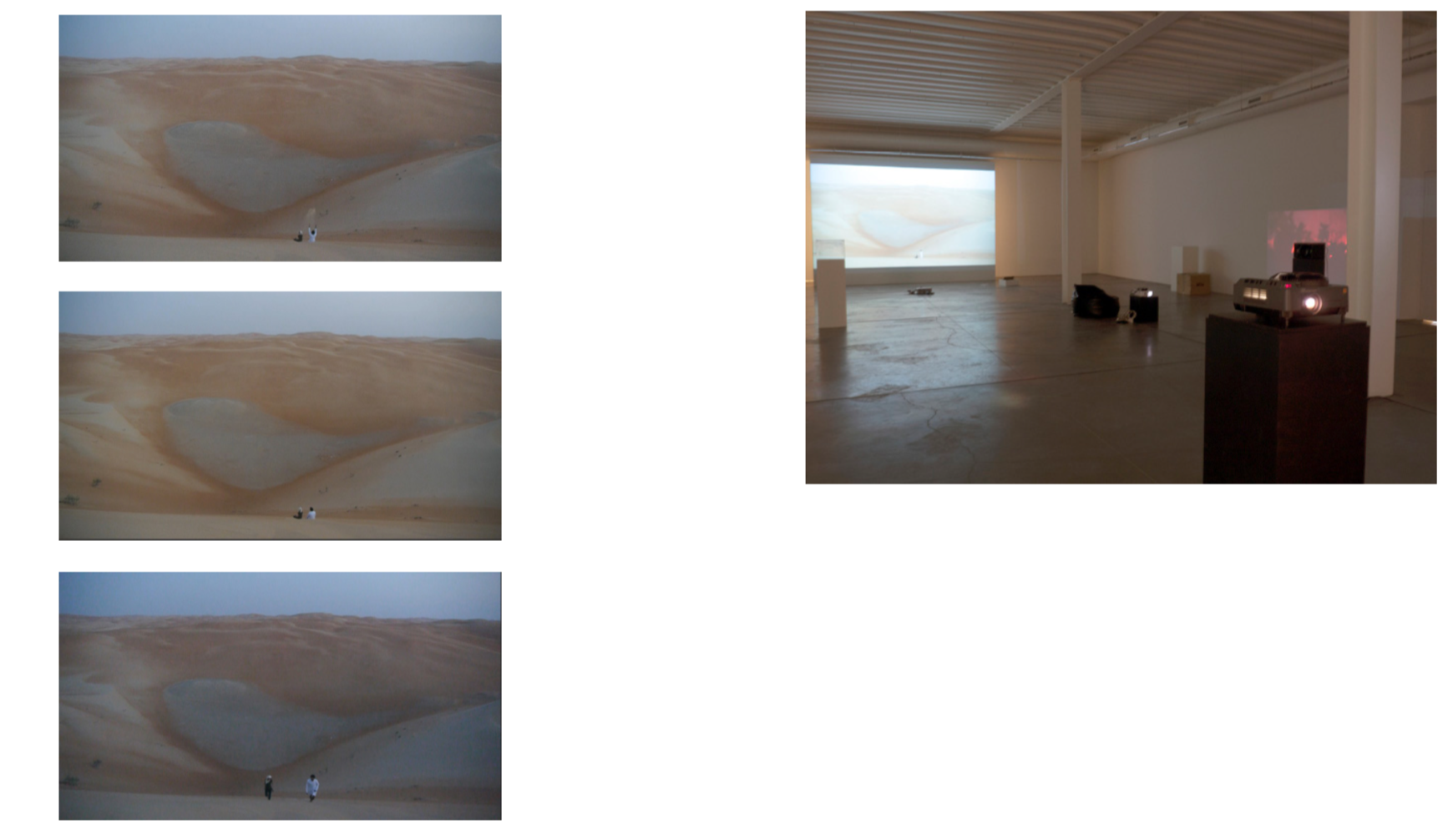 Being this specific desert located in the Middle-East, I was addressing to it, as a geographic metaphor in-between West and East. My reflexing strategies on how to move in such unmeasurable fields of contingency (possibility in balanced tension with impossibility) were influenced by both polarities, in the way I defined a goal to pursuit, as well as I allowed unpremeditated situations to happen (as mentioned before, the figures were accidentally integrated in the video frame that was pointing only to the horizon). The subtle figurative appearance (figures stand at distance, their scale in relation to the frame is minimal) provide a better effect-affect dimension. Such landscape qualities are also brought by Julien, as the affective resources: