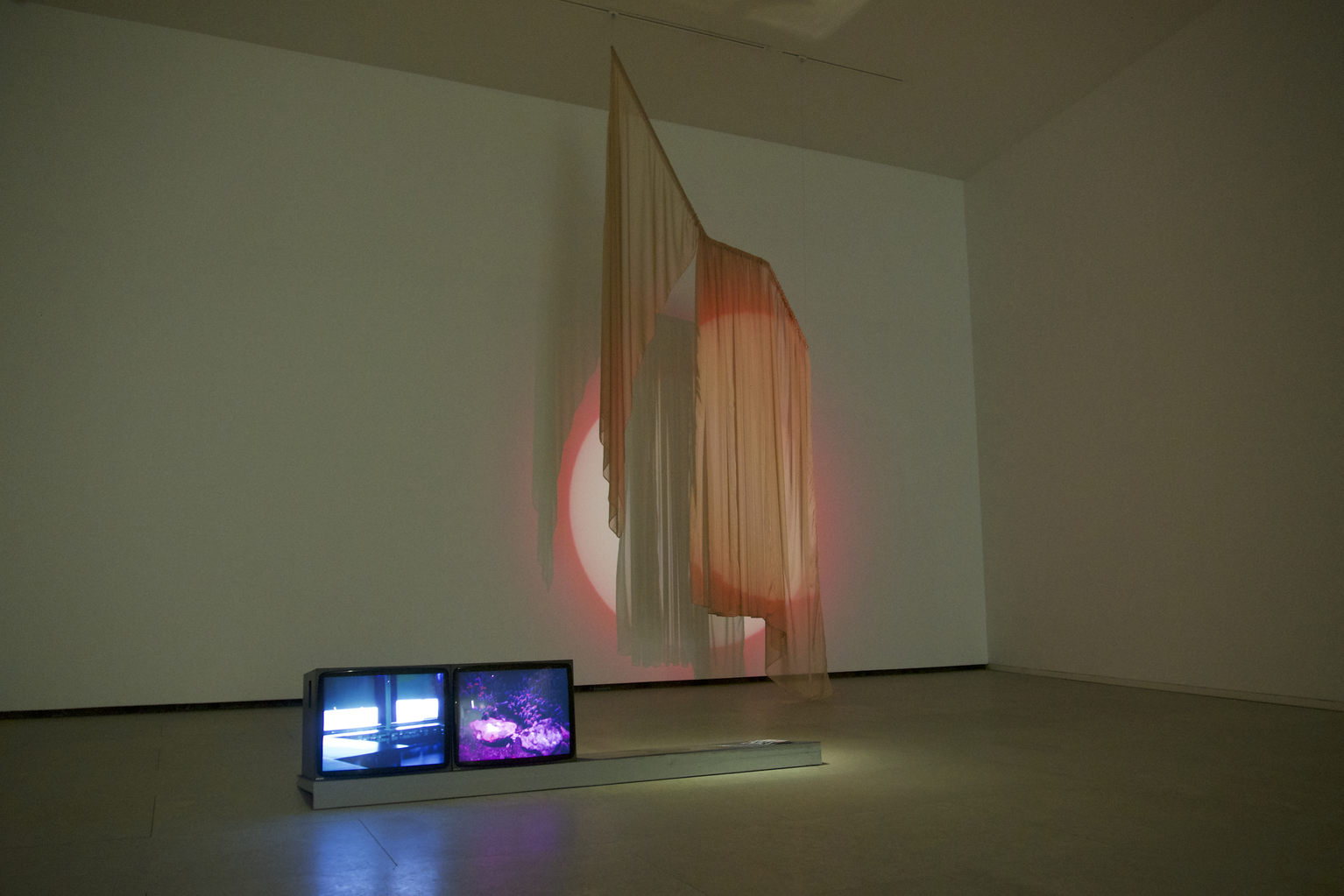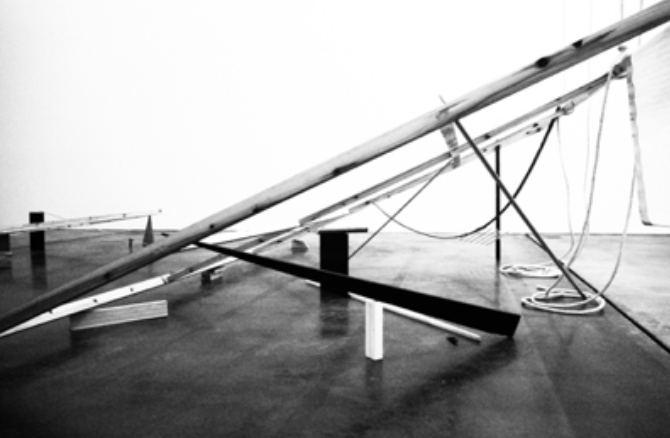 It consists of an installation, composed by two 4:3 videos displayed on two separated DNR monitors, as well as a set of two wood grid structures, robes and other diverse materials, recovered from the Art Centre depositary and displayed at some points suspended, others leaning or landing. These artefacts are assembled in order to disturb the viewer perception, by appearing at first sight, to be alighted or canted by evident supports, the robes, when in fact what sustains them is some more discrete and barely noticeable wedges.