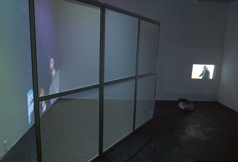 Helena et Olivier – video installation (see image). Consists on a Digital video projection 6:9, 19’ duration. It documents the witnessing of a desert’ sunset enacted by two characters (male and female). Integrated in this installation there is a physical structure at the eastern side of the projection – a plinth with a glass bell, which only contains water vapour (a hidden device under the plinth hits a water container, in order to humidify the visible glass surface). Nearby the end of three months exhibiting period, the accumulated vapour was so elevated, that it became increasingly visible in the form of water drops, draining from glass surfaces.
