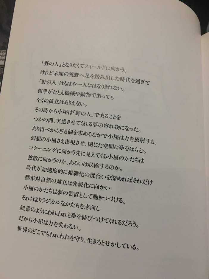 ..."A hut(小屋) exists as well in America and Europe, but the characteristic of the Japanese hut is that it is not a place to cook or shower. It is originally meant to be a protection against rain and wind. For the toilet, you go out and wipe with a leaf. It's sometimes called 雪隠 (hiding with snow). Cool. To hide in the snow is a very Japanese way of calling it. In the book The Era of the Nomad, I made a paradoxical statement that the Edo-period was one of the most nomadic lifestyles in the world, but the core of the lifestyle in this era was flooding in the town"...
