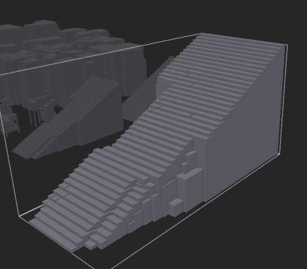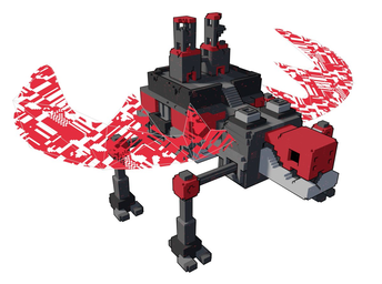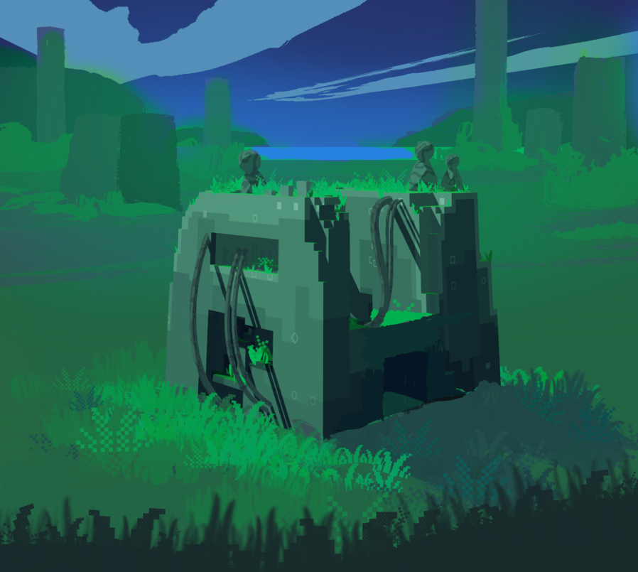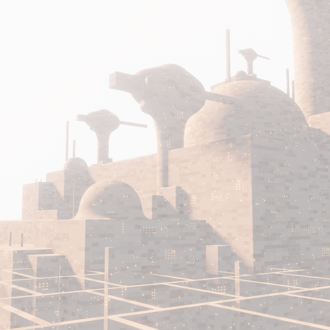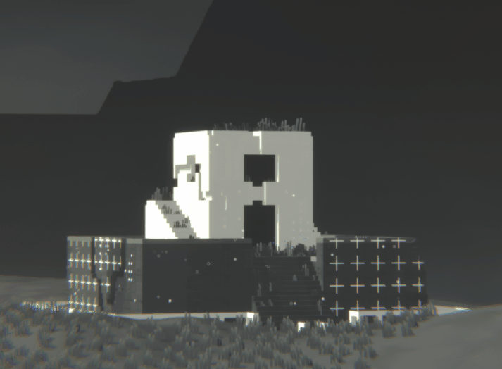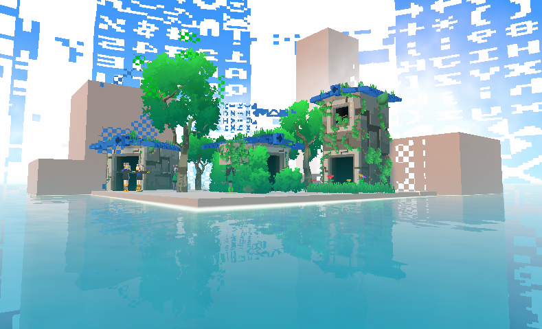 The digital parrerns of pixels can be seen on the ground and on the structures.