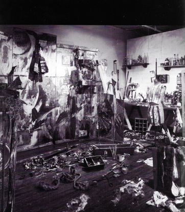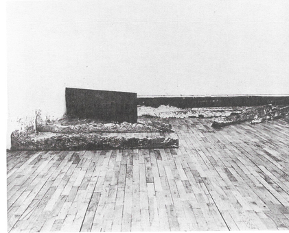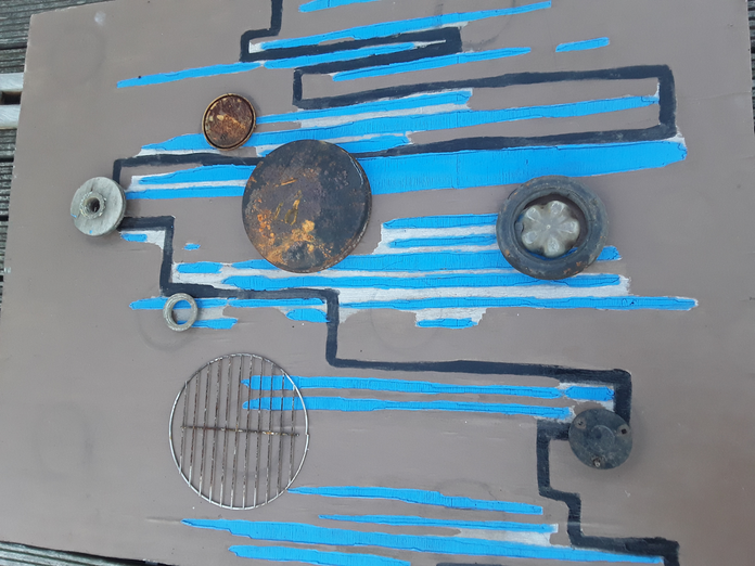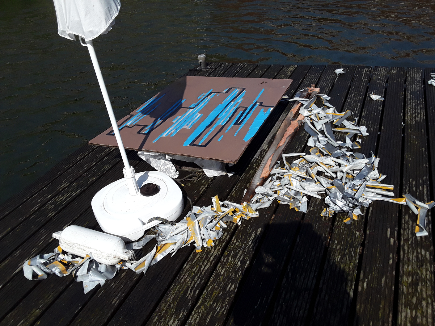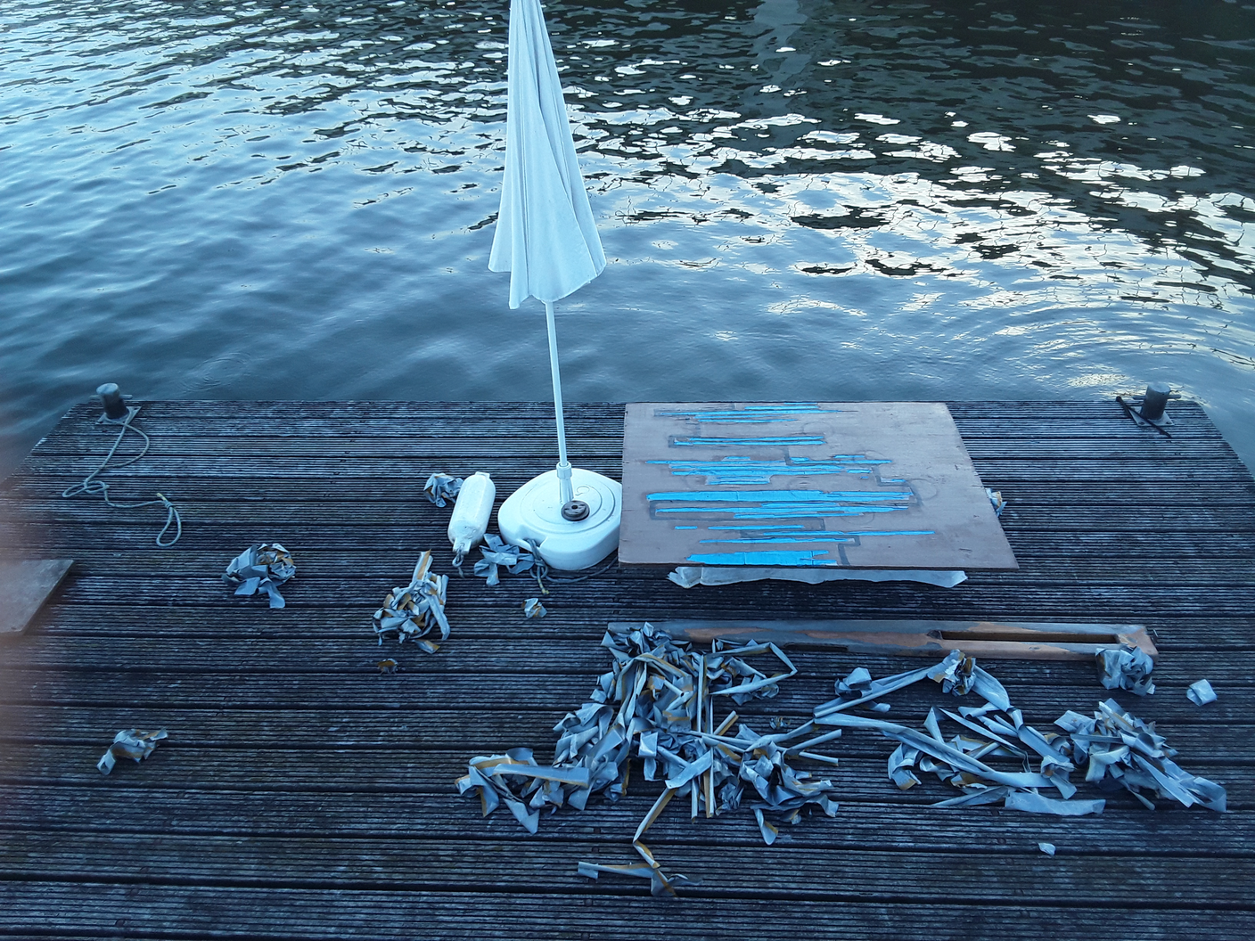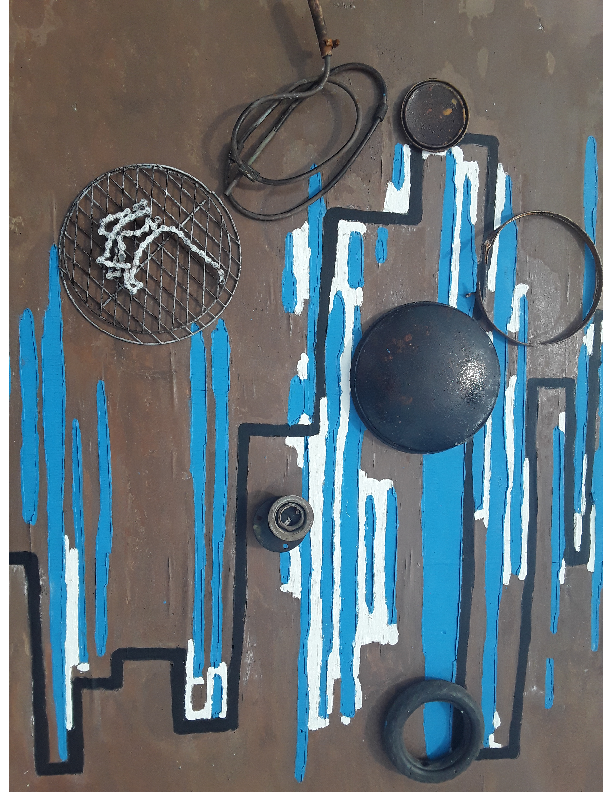 I exposed relief and improvised sculptures made with industrial paints, as well as found objects, to weather conditions, including heavy rain and wind, over a few months on a floating timber raft. Working with the changes the weather was causing to the ad hoc studio, I made changes until the painting was finished, photographed, then dumped. Someone collected the relief. I applied the colours from those available in a symbolic manner, abstracting the view of a ghetto in a large city. The objects stand for the landmarks.