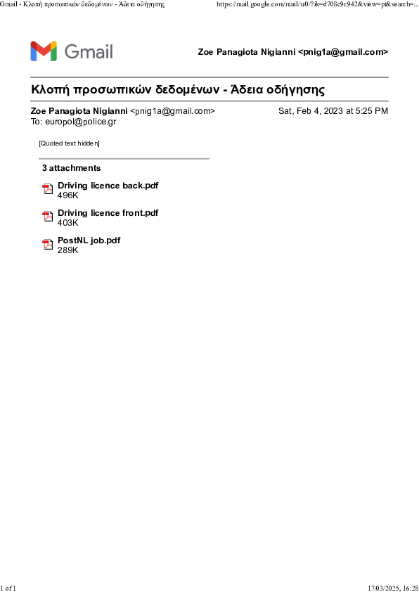 Since 2020, Forza Nuova, the Italian affiliate of the Greek Golden Dawn, with contacts in the Middle East, specifically Hezbollah, has participated in the organised international criminal case, of which I have been the target, originating from my native Greece, "accelerating" in the Netherlands and the UK in 2020, Covid-19. This happened with the theft of my personal details, specifically my Greek driver's license number, by Italians, in Amsterdam, in the winter of 2020. My number was used on four fake Italian driver's licenses,in my name known as (aka), for criminal activity in the UK. My name known as (aka) was also used on four fake Italian passports for fictitious female Albanian citizens, succeeding two fake Albanian and a fake Kosovo passports for three of the four Greek teenage users, with different details than the fake Italian ones, which three of the four teenagers had: the youngest one, also had another fake Albanian, preceding the fake Kosovo, again with different details than the other fakes she had. A deceased Belgian filmmaker's, Chantal Akerman's, life and health insurance was falsified by the use of the two fake Albanian passports in 2018 and extended with the fake Kosovo, for the youngest, in 2019.