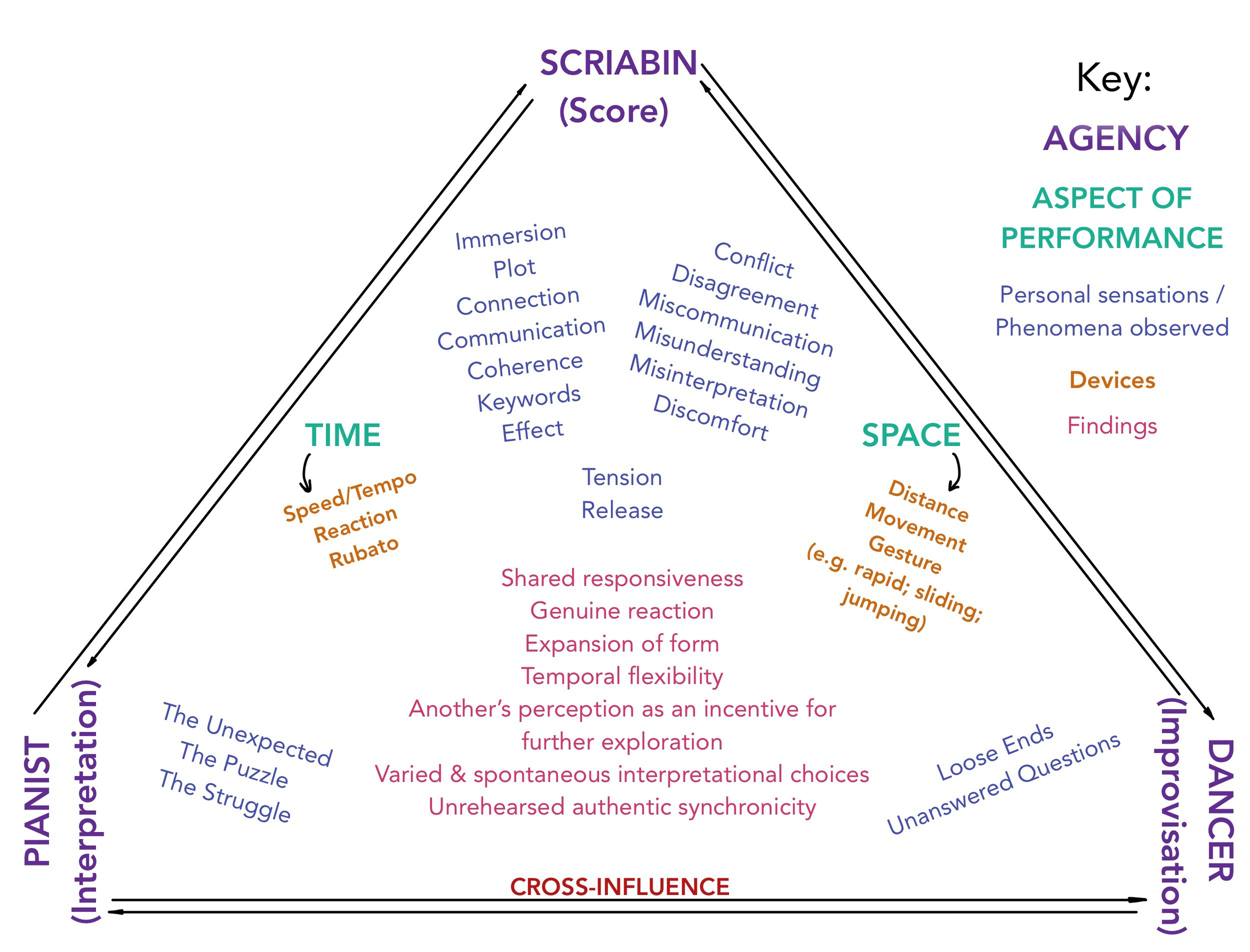 Note on the Diagram: it displays various categories of the aspects explored within the main triangle of the agencies during the research sessions: the composer (Alexander Scriabin, viewed through the scores of his works), the pianist (interpreting the works, and the dancer (improvising on the music as she was hearing it). The pianist and the dancer had an unpredictable influence on each other during the live sessions, marked as 'cross-influence', which was largely the cause of the explored phenomena and personal sensations observed. These were placed in five different categories: the 'positive' (or rather useful, on the top left), the 'negative' (or rather useless, on the top right), the 'challenging' (on the bottom left), and the 'unresolved' (on the bottom right). The tension and release were intentionally placed in the center, representing a dichotomy of their own, as they were in fact at the core of the process. The diagram also lists devices used to evaluate the artistic outcomes through the prism of the time and space. The large list on the bottom center outlines the findings and outcomes that were derived from the research sessions and has been influencing our subsequent work.