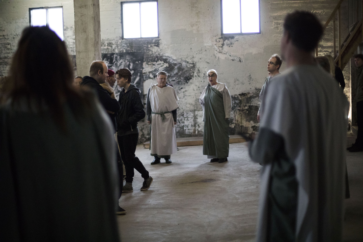 This practical artistic research project explores how the performance of acoustic sound in dialogue with site can create a sonic scenography, experienced by an audience from within the sonic structures. Six art projects were carried out in the context of this research. Their form varies due to the site-sensitive approach that is employed: the space and the participating musicians are both the source and the frame for the resulting spatial sound performances. During workshops the collaborating musicians are introduced to site-sensitive methods. They learn full-body listening, spatial sounding, and space-care. The musicians learn to co-create with the space. In a collaborative process, spatial sound compositions are created using the site-specific sonic material that is elicited from the dialogue between the performers and the space. The relation to the audience plays an important role in the sharing of the performance space and the experience of the sonic scenographies. Therefore, active audience encounter is considered during the creative process towards the performance and it is further explored during each performance. As sound is invisible and ephemeral it is a vulnerable material to engage with when creating scenographies. In this research its instability has revealed itself as an indispensable quality of a scenography that aims to connect the elements of a shared space and make their relations perceivable. There is a tendency to make ‘reliable’ material scenographies and to sustain spatial sound through audio systems while attempting to overcome the challenges a site brings to performance. This approach to performance, scenography, and spatial sound composition, however, limits the relation between acoustic sound and site. In my sonic scenographies the performers are dependent on the dialogue with the space in order to create sonic structures that can be experienced by an audience. The attention needed for this collaboration is space-care. It includes care for all entities in the space, and especially the audience. The ephemeral quality of acoustic sound creates an active sonic scenography that performs together with the musicians, and engages multimodal listening. The resulting spatial sound performance includes the placement and movement of sonic expressions that are specific for each instrument-site relation. In the created performance, as the audience can ‘roam through’ it, they can experience a sonic scenography that unfolds around them. In the interaction of performers and audience in these shared spaces (architectural space and sonic space) a social space can develop that allows for an ephemeral community to emerge.