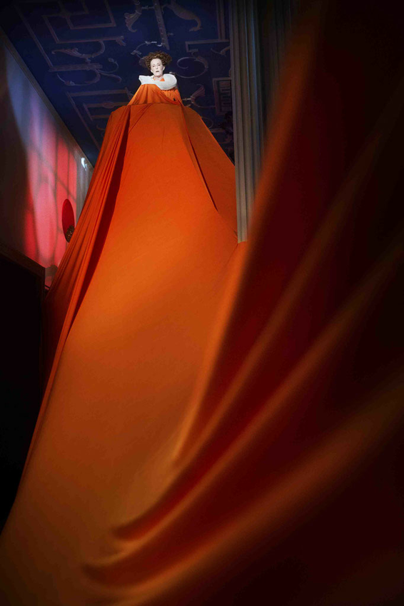 Back at the Norwegian Theatre Academy the dialogue between sound and space was ever-present in my artistic explorations. One work, for example, was Great Grand Mother (2014), again for Folkoperan. Together with my colleagues Freya Sif Hestnes and Ann-Mirjam Vaikla, I created a hybrid sculpture-costume that ‘grew’ upwards to the ceiling and spread like a landscape around the columns of the Tempel Foaje. The singer Ulrika Tenstam improvised on Kindertotenlieder by Gustav Mahler whilst enthroned by the fabric structure, which was also her dress. The audience could go underneath the singer and experience different acoustic spaces and therefore different impressions of the singer’s voice. The unusual position of the singer allowed for different physical relations to her and her voice. One could experience one’s own body through the active exploration of the different spaces and alter the relation to the surroundings when moving between the inside and outside of the sculpture. To consider the audience member as an explorer through a sonically shifting landscape revealed itself as a promising idea.