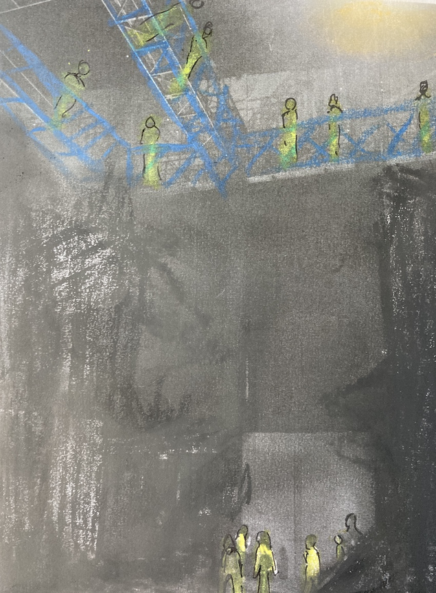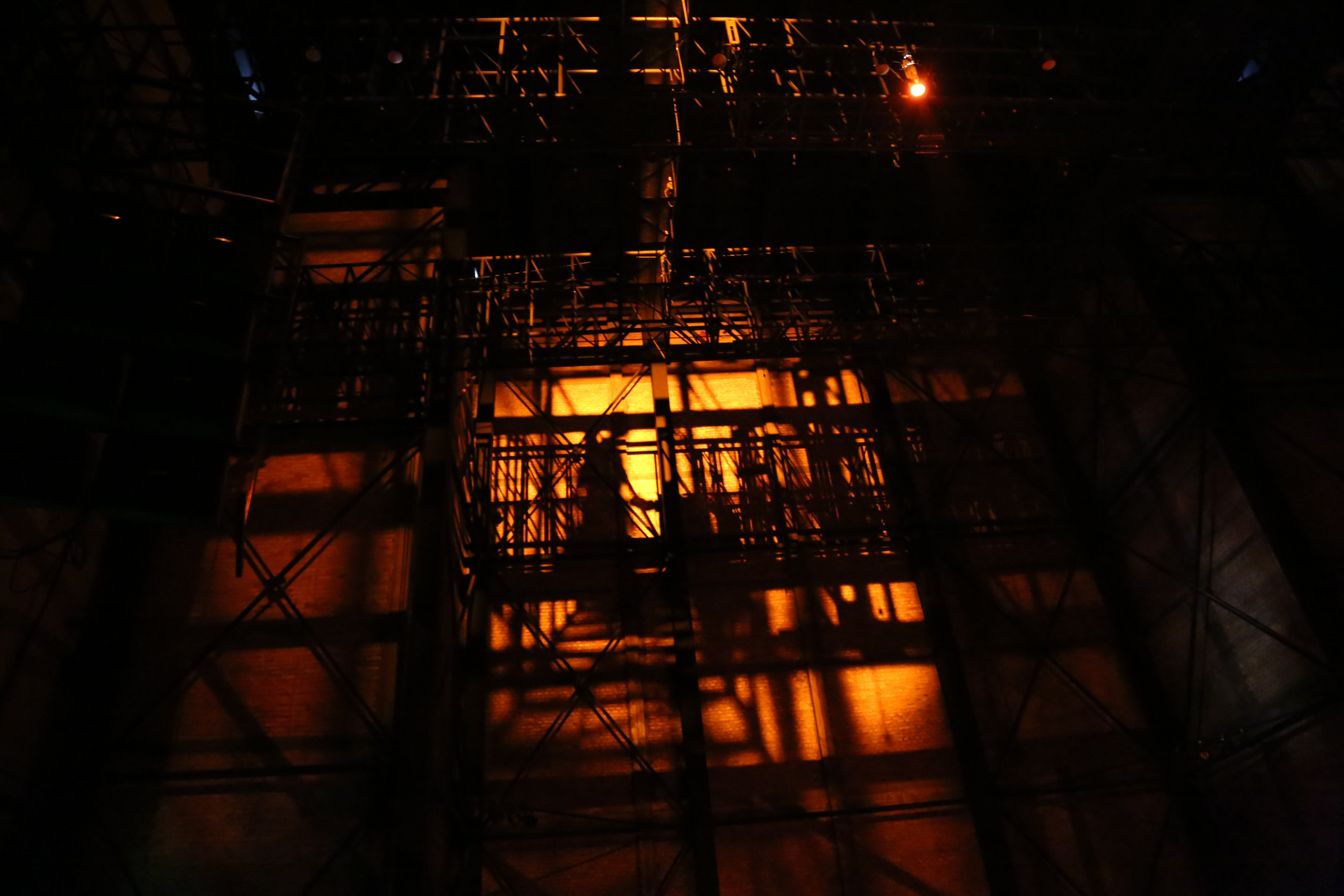 In order to play the space from the metal grid, the singers received harnesses and safety training on how to move on the grid. We did not play the grid for sound since it is a safety structure, but the opening and closing of the clamps when the singers moved on the structure was made an audible part of the composition in the end.