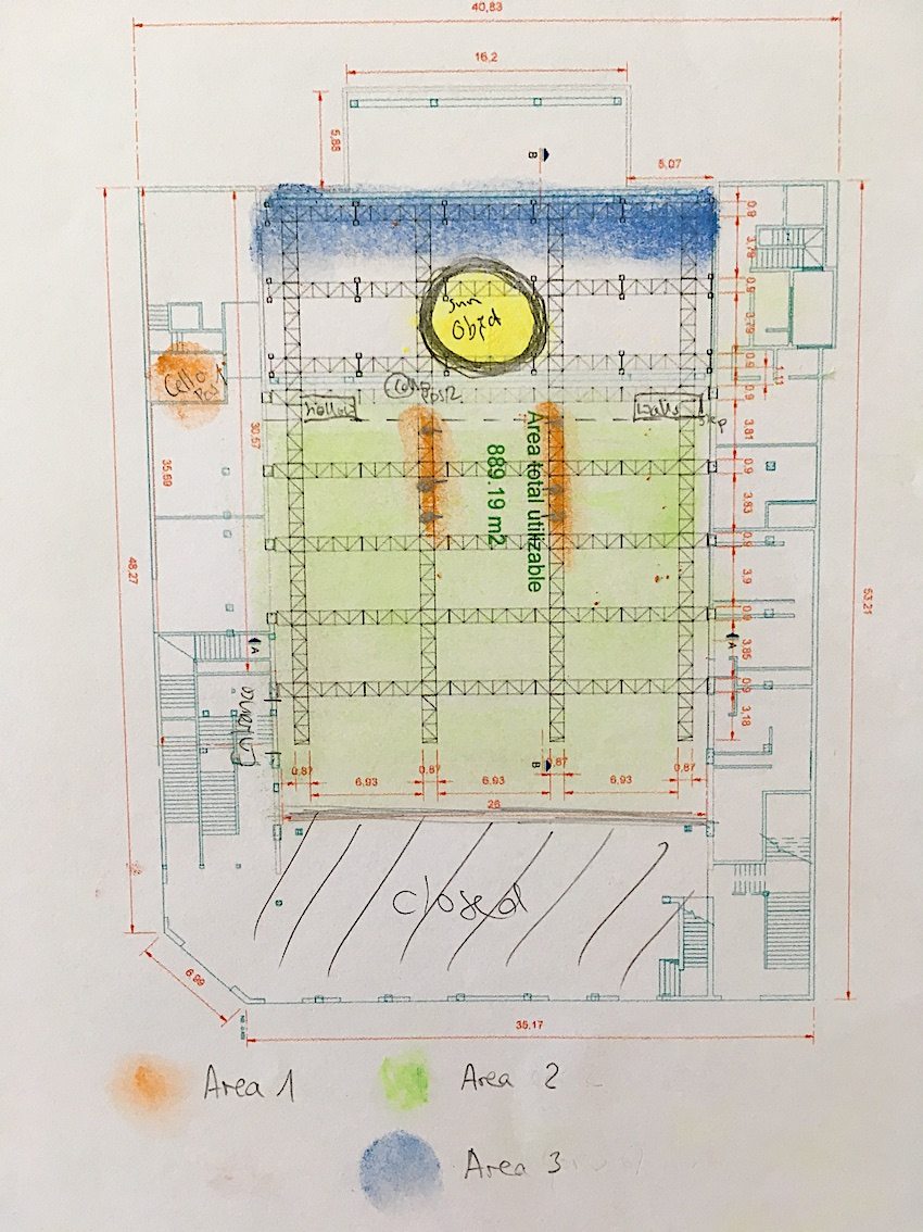 When I was back in Stockholm, I kept thinking about this space and how it would enable me to explore vertical movements of sounds by placing musicians on the metal grid, with the audience able to move freely beneath the musicians. Soon I started to prepare the project by getting in contact with LARVA and the University of Guadalajara with the help of my collaboration partner, the architect and light artist Juan Perdo Ponce Bolanos. I asked for percussionists, string instrumentalists and singers from the university’s music department. Together they could play the architecture in different ways. Since the space was so enormous, I was inspired to use the ‘Music of the Universe’ as the theme. I researched the philosophy and poetics of this idea, and caught up on the newest developments in Asteroseismology, which is the science that studies the internal structure of stars by the interpretation of their surface pulsations (Aerts et al., 2010). In order to explore the movement in the universe while it appears still, I invited choreographer Karina Bosche to join me on this project. Less than one year later I found myself back in the space that had been fascinating me from a distance.