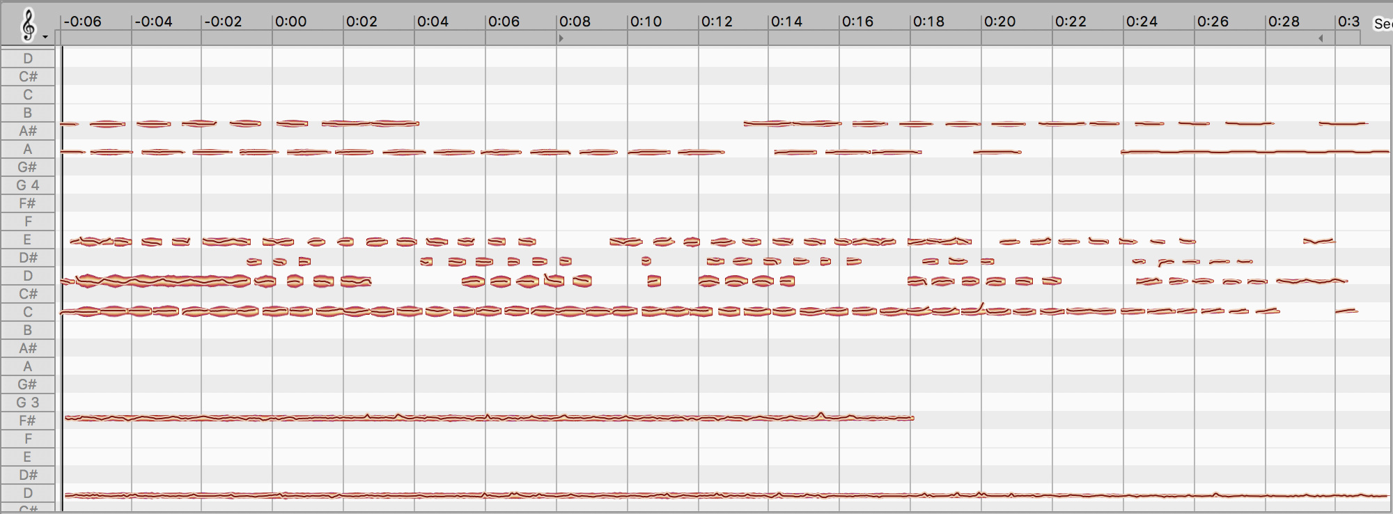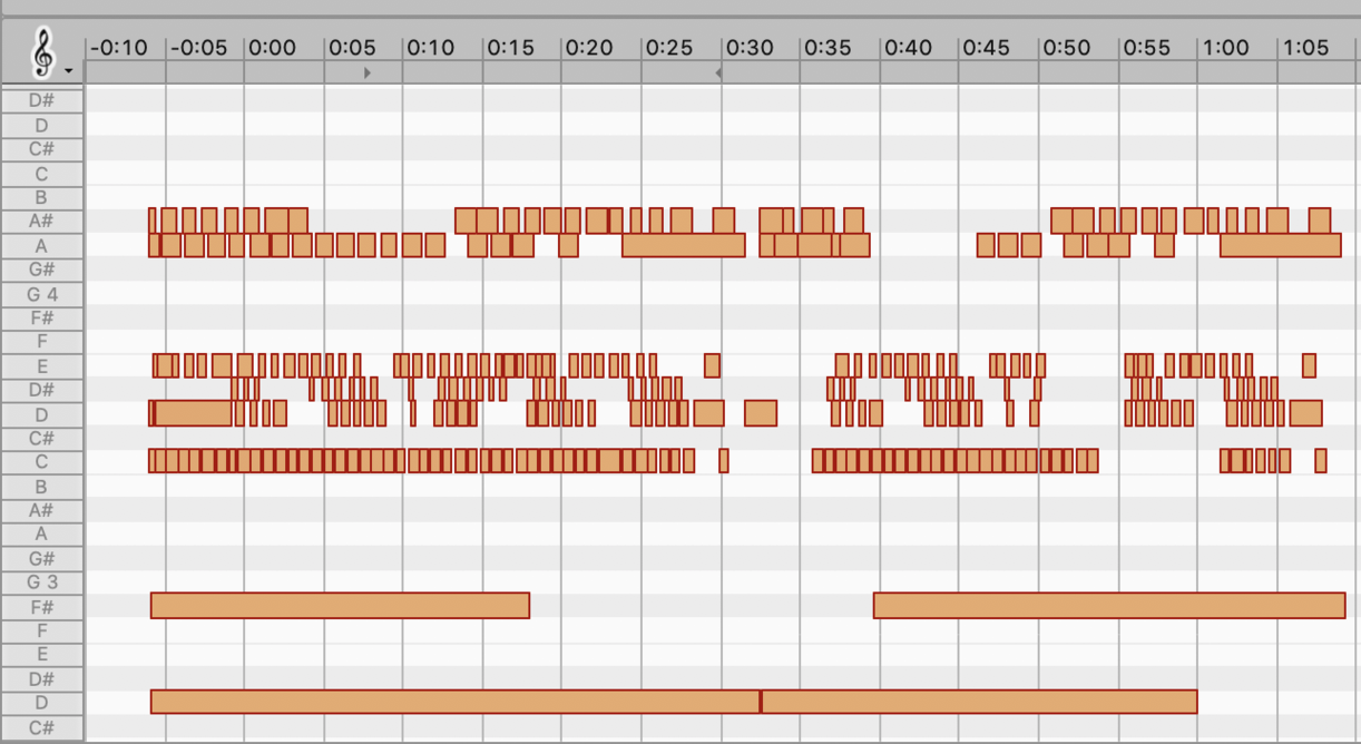 There are relationships between the voices which I want to explore further, also in order to compose relationally, so an outside ear (conductor) won't be necessary to connect the different voices - but the singers know their role in relation to the other voices at all points. For example, as you can see in the image below, the pitch note C4 and F#3 start at the same time but finish at different points in time.