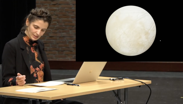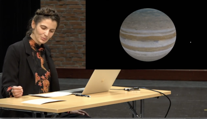 Mareike Dobewall presenting compositional planning for the Jupiter System during her 80% seminar at Hugoteatern in the Opera Department.