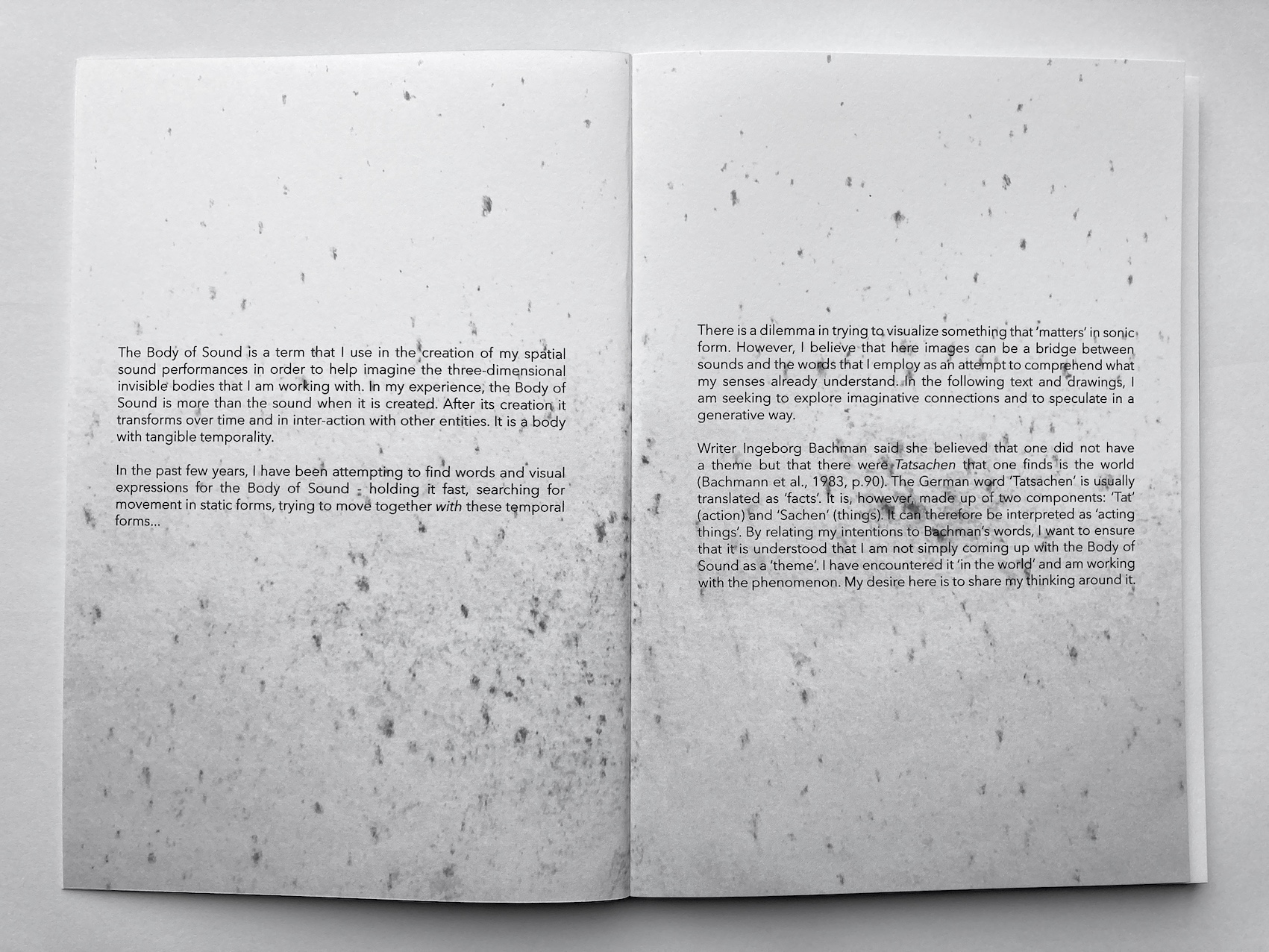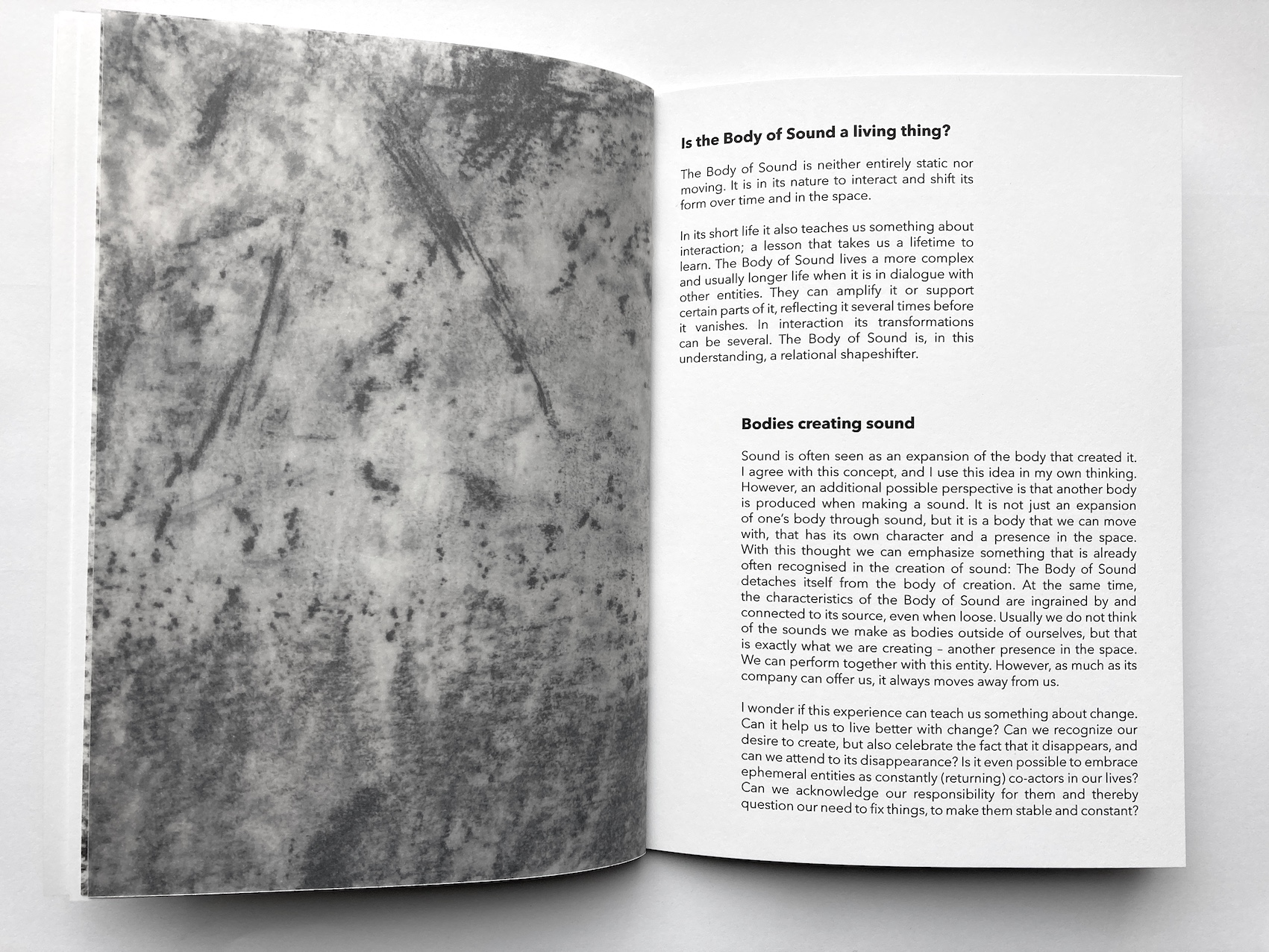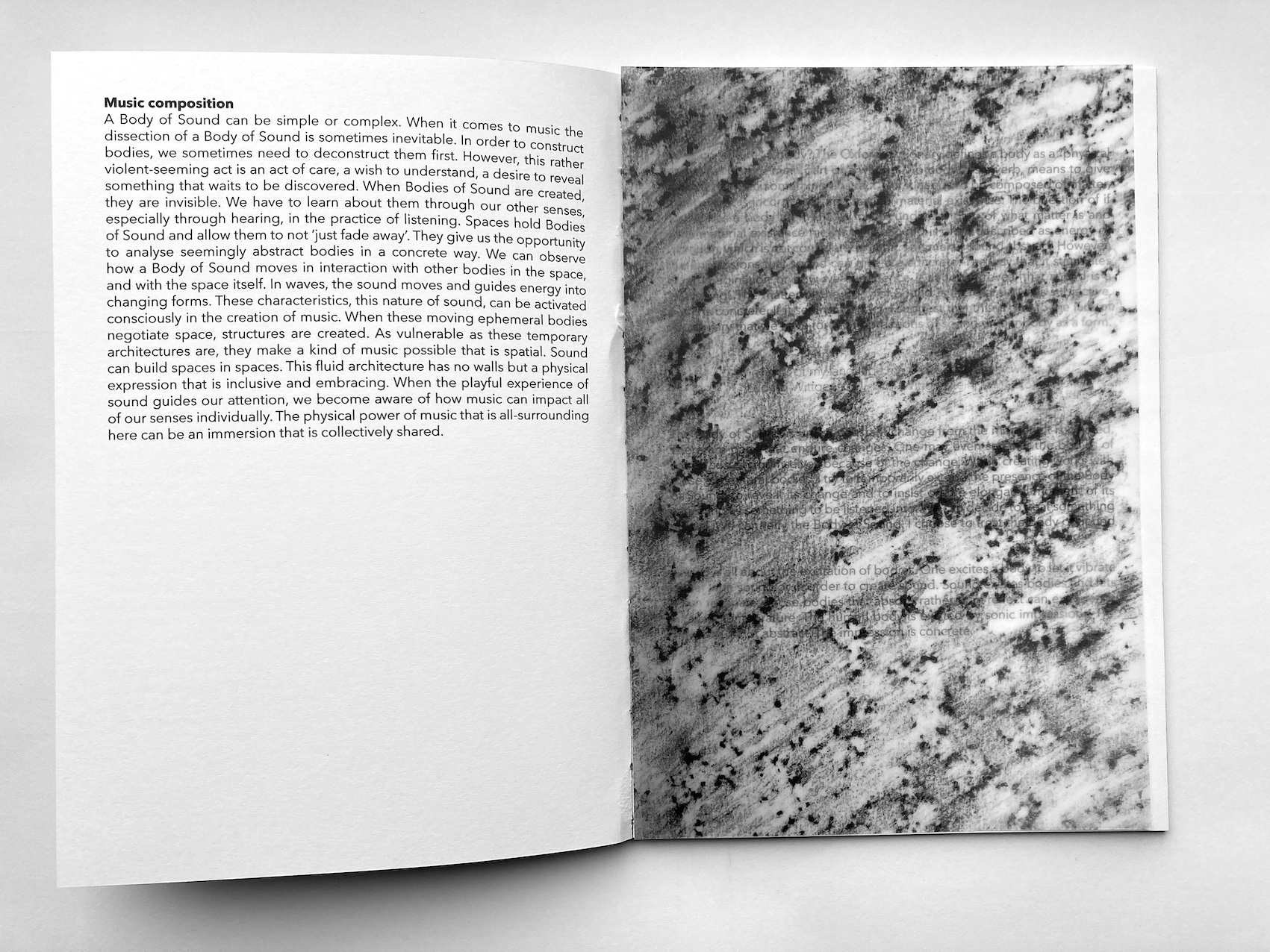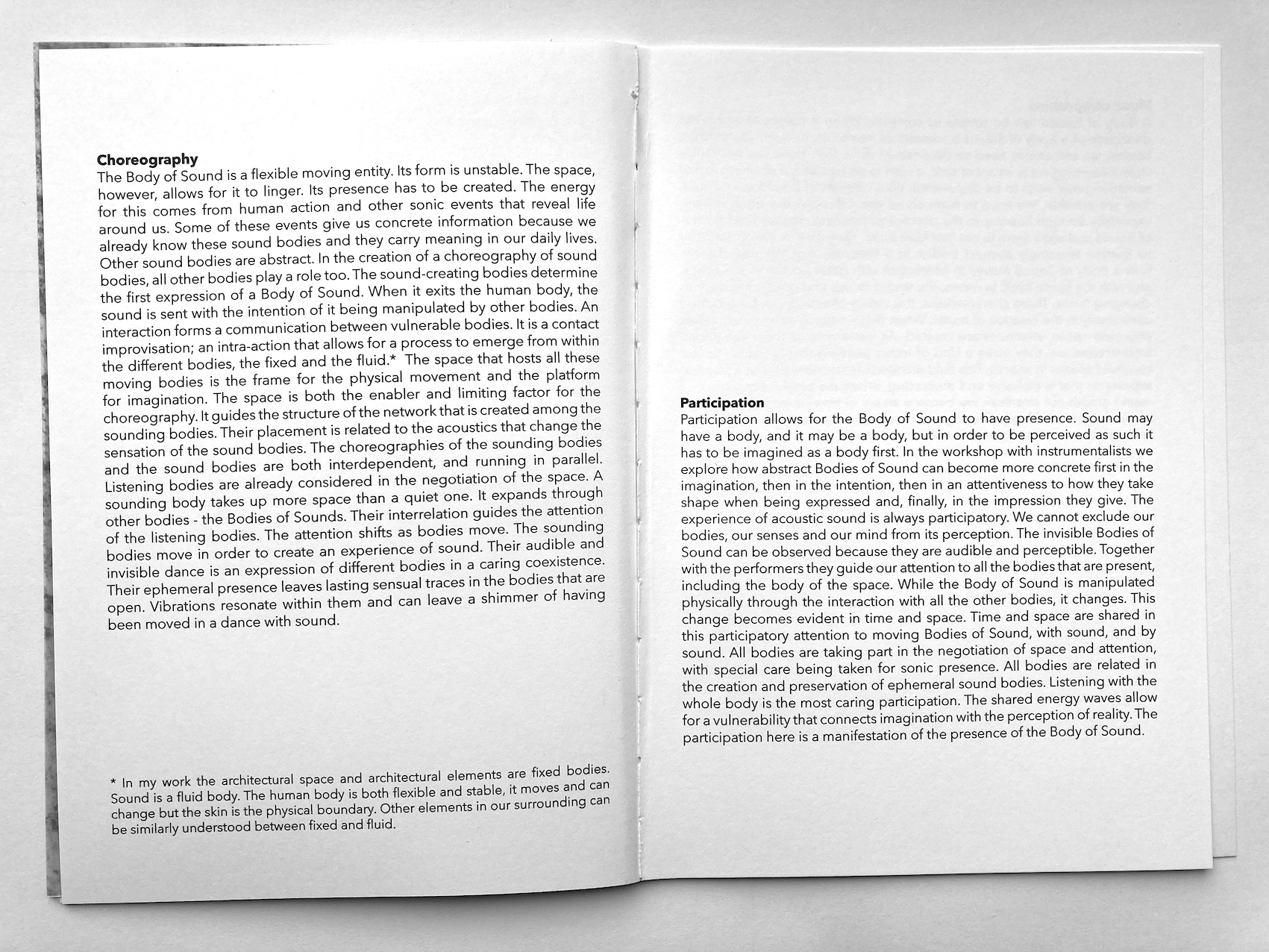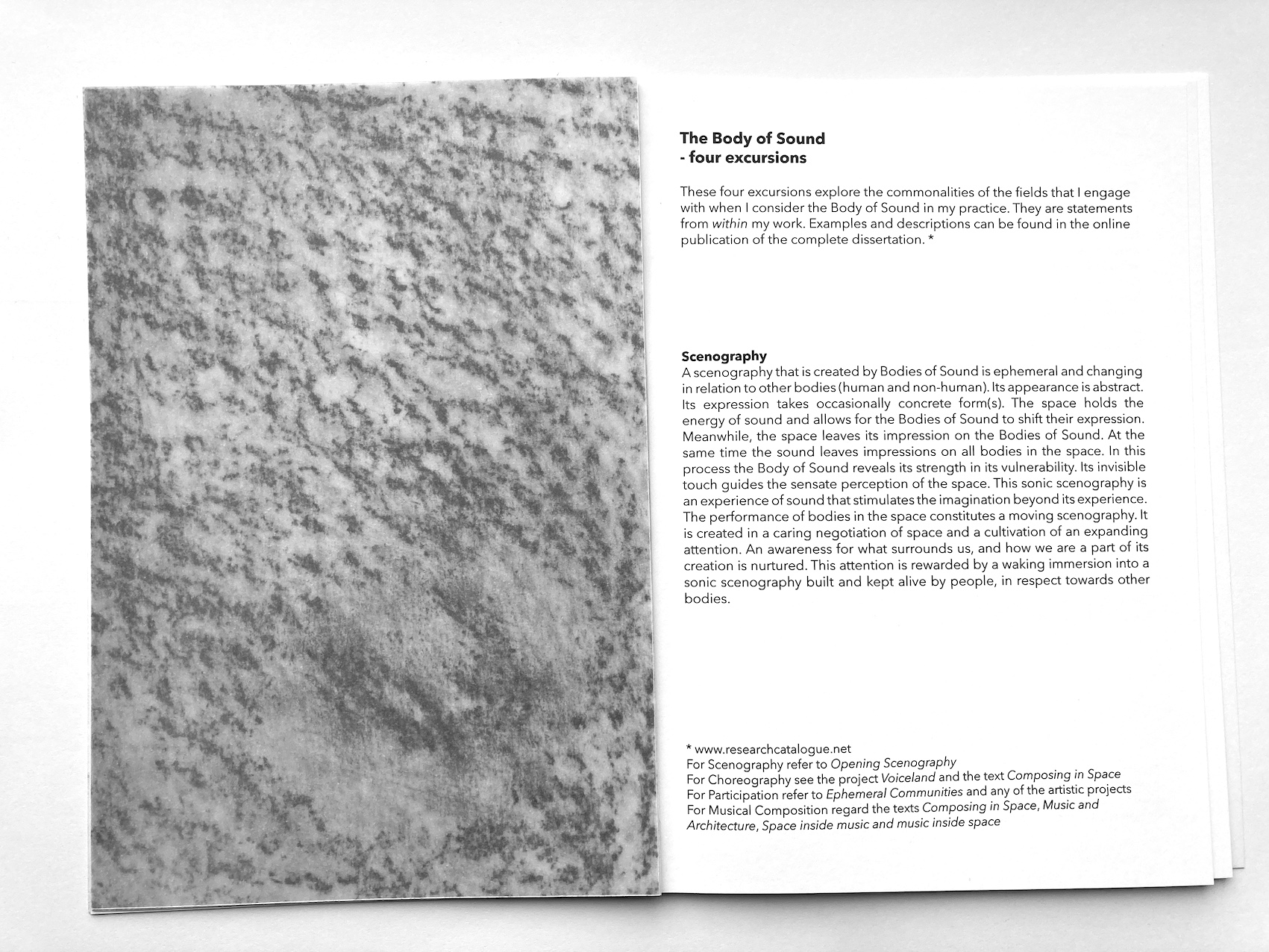 This practical artistic research project explores how the performance of acoustic sound in dialogue with site can create a sonic scenography, experienced by an audience from within the sonic structures. Six art projects were carried out in the context of this research. Their form varies due to the site-sensitive approach that is employed: the space and the participating musicians are both the source and the frame for the resulting spatial sound performances. During workshops the collaborating musicians are introduced to site-sensitive methods. They learn full-body listening, spatial sounding, and space-care. The musicians learn to co-create with the space. In a collaborative process, spatial sound compositions are created using the site-specific sonic material that is elicited from the dialogue between the performers and the space. The relation to the audience plays an important role in the sharing of the performance space and the experience of the sonic scenographies. Therefore, active audience encounter is considered during the creative process towards the performance and it is further explored during each performance. As sound is invisible and ephemeral it is a vulnerable material to engage with when creating scenographies. In this research its instability has revealed itself as an indispensable quality of a scenography that aims to connect the elements of a shared space and make their relations perceivable. There is a tendency to make ‘reliable’ material scenographies and to sustain spatial sound through audio systems while attempting to overcome the challenges a site brings to performance. This approach to performance, scenography, and spatial sound composition, however, limits the relation between acoustic sound and site. In my sonic scenographies the performers are dependent on the dialogue with the space in order to create sonic structures that can be experienced by an audience. The attention needed for this collaboration is space-care. It includes care for all entities in the space, and especially the audience. The ephemeral quality of acoustic sound creates an active sonic scenography that performs together with the musicians, and engages multimodal listening. The resulting spatial sound performance includes the placement and movement of sonic expressions that are specific for each instrument-site relation. In the created performance, as the audience can ‘roam through’ it, they can experience a sonic scenography that unfolds around them. In the interaction of performers and audience in these shared spaces (architectural space and sonic space) a social space can develop that allows for an ephemeral community to emerge.