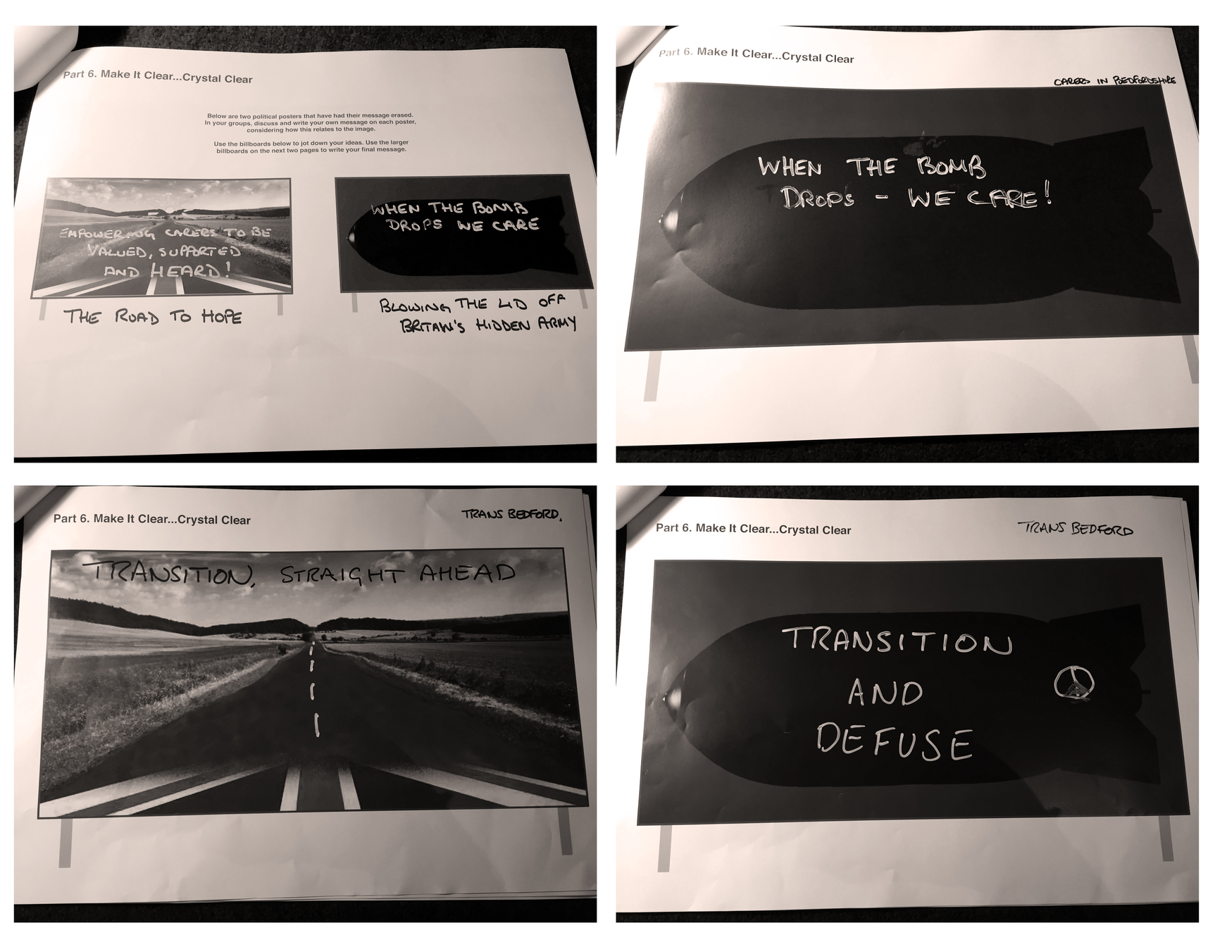 In one example, a woman from The Multi-Heritage Organisation had, in the first workshop, reported that her hijab had been pulled off the week before and, through the contrast writing exercise (‘not x..’), the phrase ‘I’m a mother not an extremist’ emerged which would be used on the final billboard.