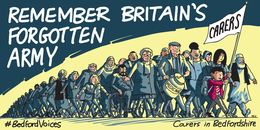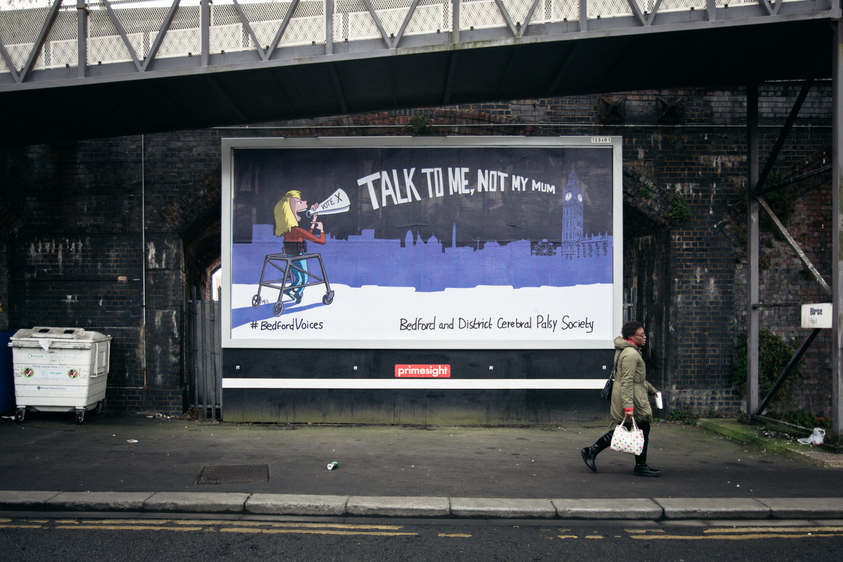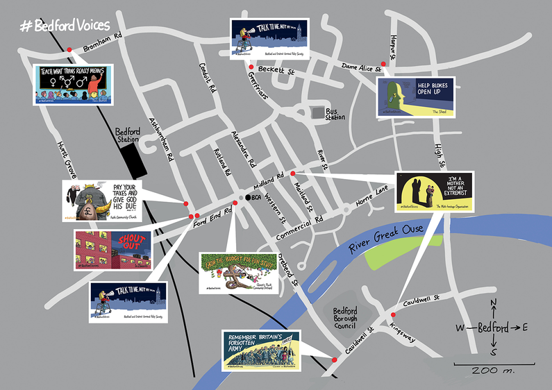 The groups involved included the Bedford and District Cerebral Palsy Society’s powerful image of someone with a neurological condition shouting to Westminster through a megaphone constructed from a rolled-up ballot paper “Talk to me not my mum!” Carers in Bedfordshire’s billboard depicted ‘Britain’s Forgotten Army’ with an illustration of a group of carers from all backgrounds marching. The Multi-Heritage Organisation showed a mother holding her child yet casting a shadow of a suicide bomber with the slogan ‘I’m a mother not an extremist.’ Other groups included TransBedford, whose image highlighted the ongoing lack of education on the issue of Transgender, plus Faith Community Church, Queens Park Community Orchard, The Shed Bedford, a men’s support group, and a community urban radio station In2Beats.
