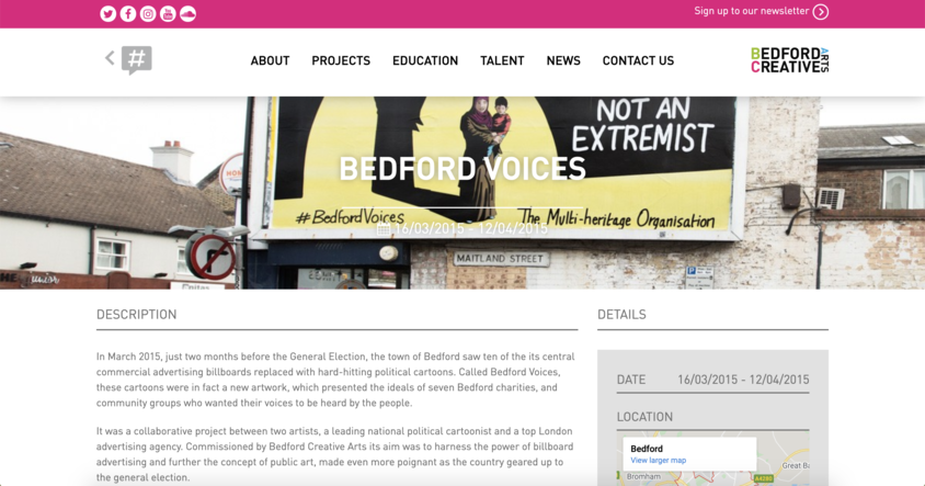 • From 16 March- 12 April 2015, these people’s political posters were exhibited across Bedford town centre at various locations. Audience Impact estimated by Bedford Creative Arts at 1.232m based on 160,000 people seeing it over 7 times.