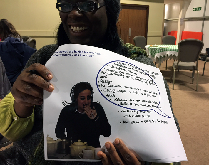 Workshop 2 - 14th February 2015 – At this stage, Dash N’ Dem activated the political research they had done using participatory methods and performance. This included gaming and role play: i.e. tea with David Cameron; a talent show; and contrast writing exercises (‘not x..’). Here, role play was a catalyst for bringing out real conversations - developing different ideas that would contribute to the end outcome so it really was the group talking back.