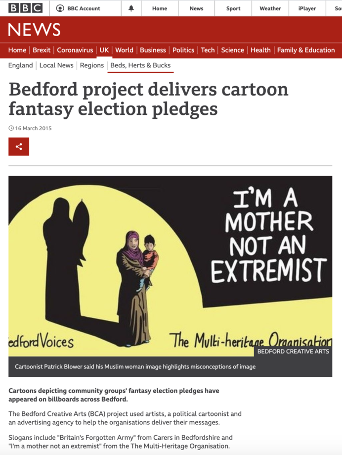 • ’Bedford project delivers cartoon fantasy election pledges’, BBC online (Beds, Bucks and Herts), 16 March 2015: http://www.bbc.co.uk/news/uk-england- beds-bucks-herts-31902794