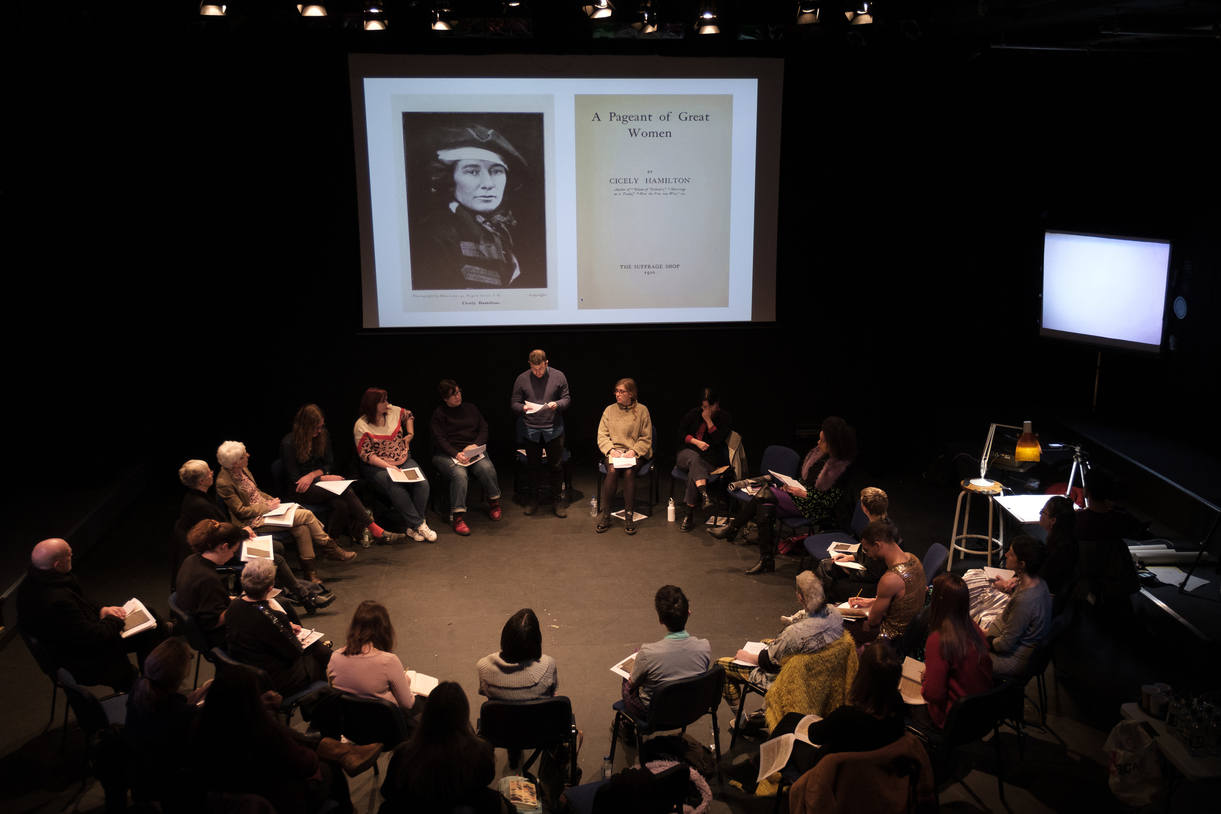 The project aimed to re-script A Pageant of Great Women, a Suffrage Play written by Ciceley Hamilton in 1909. This allegorical work of political agitation featured the embodiment of Justice, Woman and Prejudice, with a cast of 45 historic great women to promote a feminist perspective on emancipation.