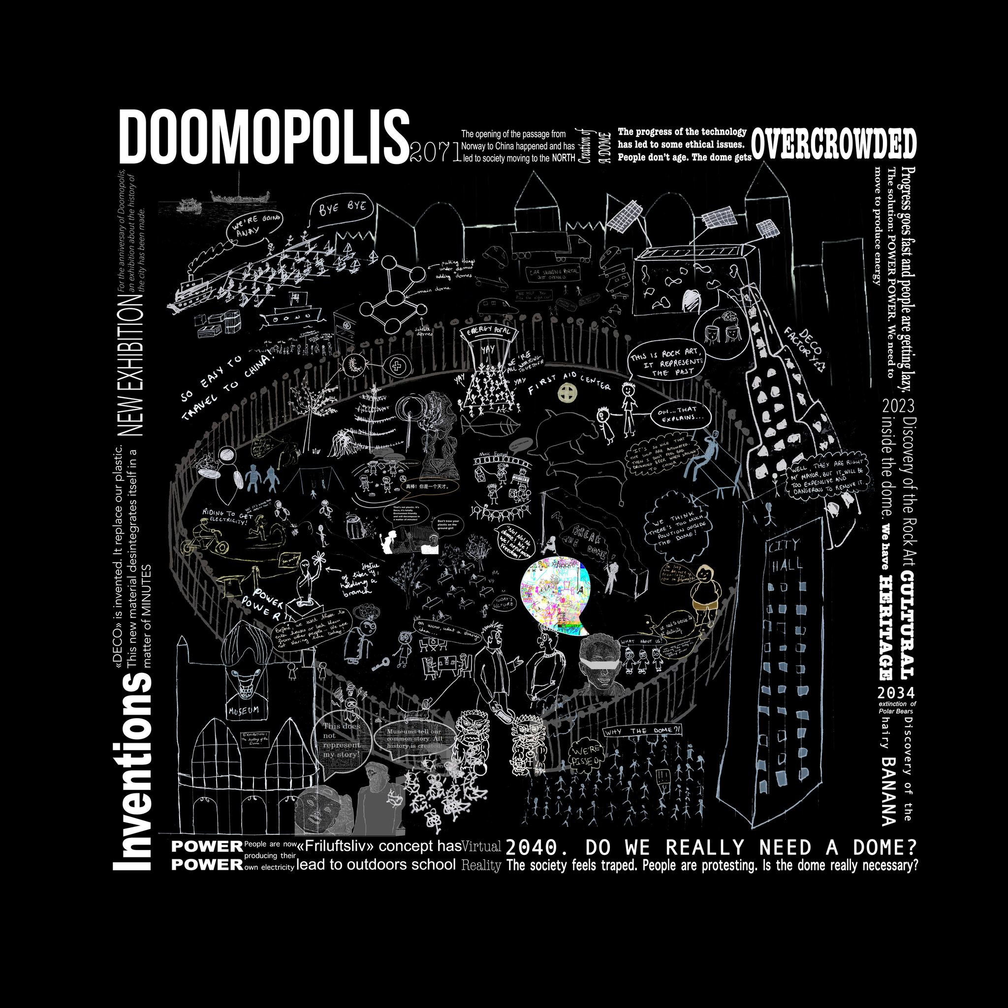 This project reflects daily life situations of a population living in 2071. The city we have designed is placed under a dome, because of climate change and to protect people from the polluted air. By acting like a giant greenhouse, this dome city allows the population to grow many types of plants, even up in the North, where the city has been built. Also, the technology has evolved a lot and people are now relying more and more on it. Some aspects of it are good, we can cure illnesses faster and better for exemple. But by relying too much on technology, some people are getting lazy. Also, like in every civilizations, not everyone is about about the situation. People here are protesting against the dome that has been built to protect the city. Some other are complaining about how their history is brought to light. This project shows us that no matter the generations, or the places, it is in the nature of human being to complain and speak their minds, because it relates to feeling. People evolved, mentalities and habits changes, but we all stay the same in a way.