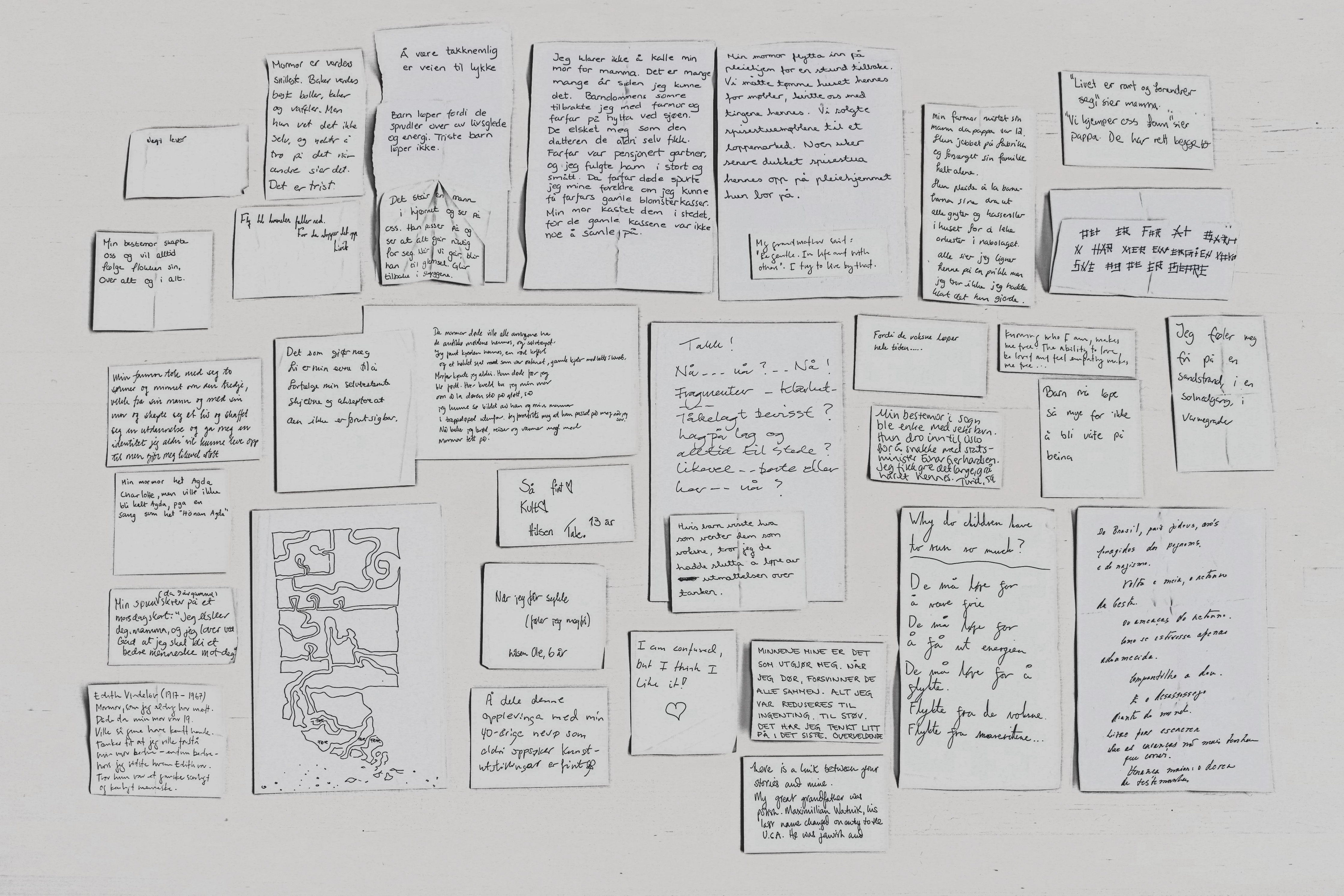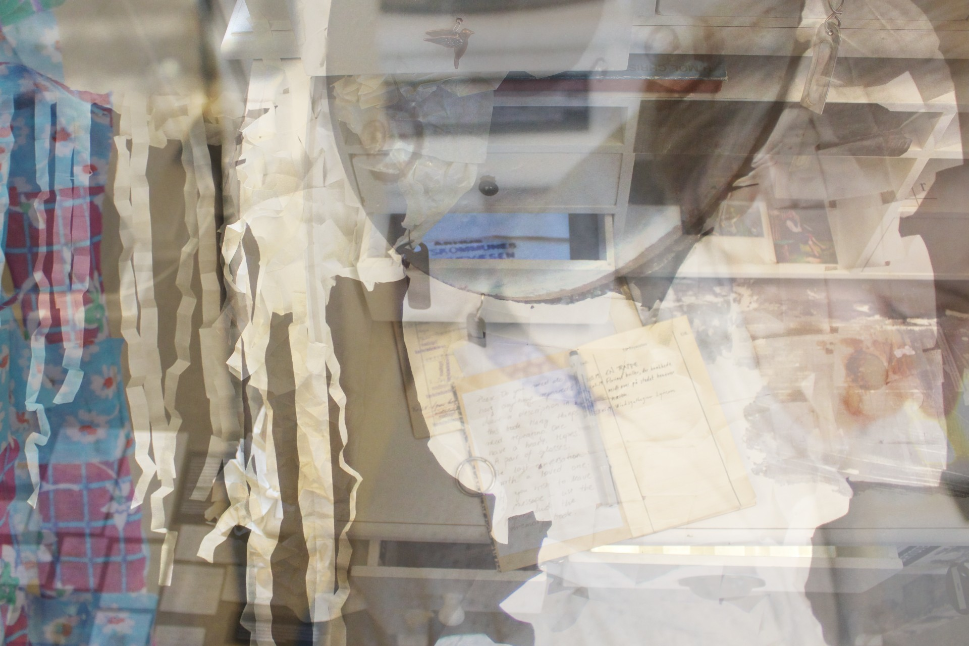 Standing somewhere in the middle of Ruins Collected, you will hear, ever so subtly, the voices of Grandmother, me and my father, and the neighbour’s dog barking in the background. This is a recording I made in my parent’s garden, while my grandmother was still alive, telling the grim part of her life story. You will be able to see the long tessellation - woven paper with the projection of her and our homestead. You will see as well a screen connected to a manifestation of the machinery from Fossekleiva. My grandmother will also be present in the writing desk from Ruins Ovartaci. With the same pictures but text instead of my grandmother herself telling the story.