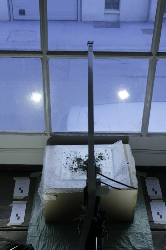 maintenance day - water bottle needs refill, and the paper markers are increasingly wrinkled from receiving drops over and over again, especially the top right mark, which caused a failure in detection yesterday or the day before yesterday. I replace them with fresh markers that are now laminated. Hopefully this doesn't cause too much shift in detection perspective from yesterday to today. I also began scraping off more yellow lichen fragments from a fallen branch I had collected a while ago. Will add them slowly not to cause a massive change at once in the image.