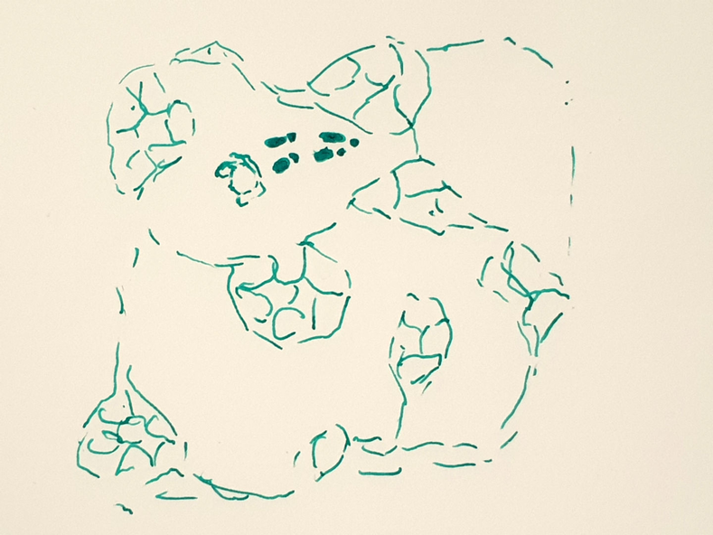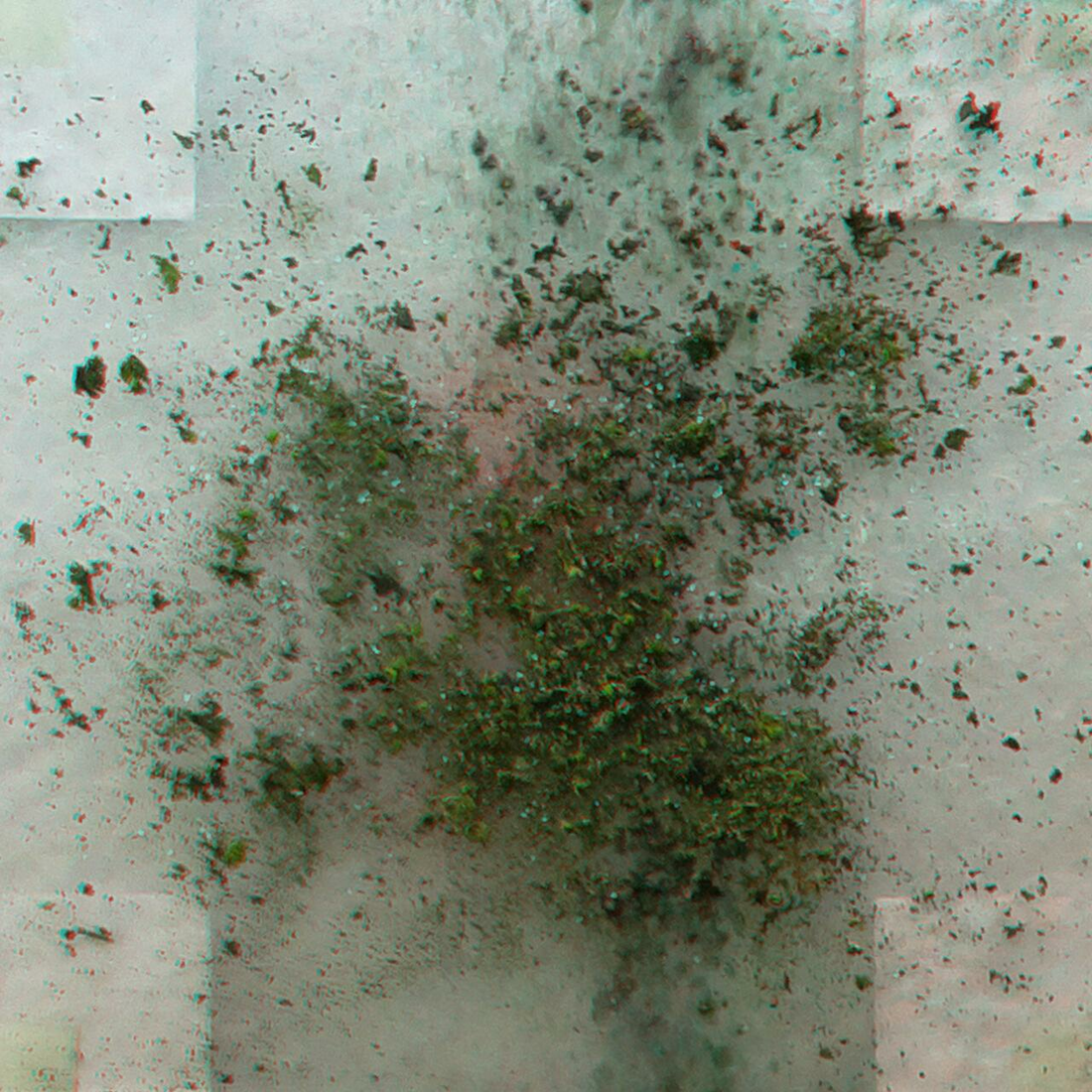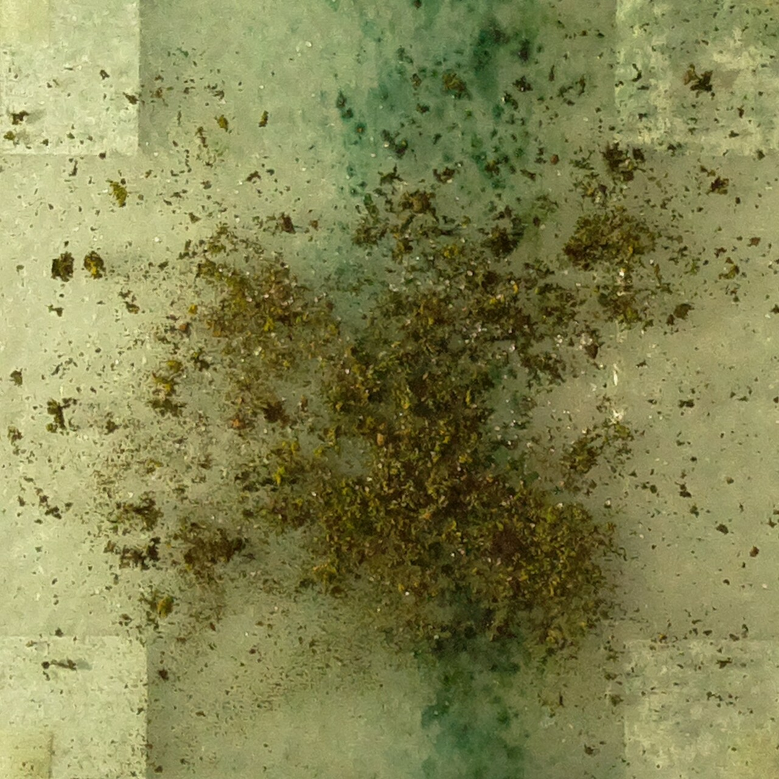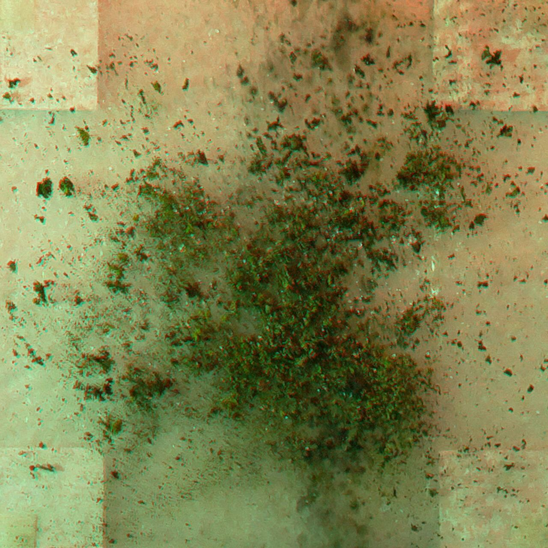 the “low frequency” changes of repeated nutrition spells, visible below in the new blue-green fond, are processed in the stereoscopic vision as “metallic” surface, as different ways the light reflects depending on the angle. Pictures are taken one month apart. The top right corner circle marker paper is increasingly changing, as it is the only one apparently that is hit by the water again and again. Nevertheless, it does not seem to have a huge impact on the ability to form a stereo image. {date: 210528}