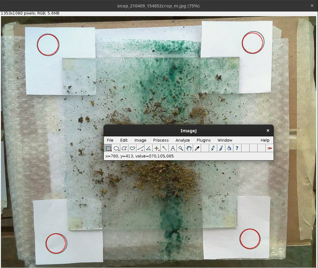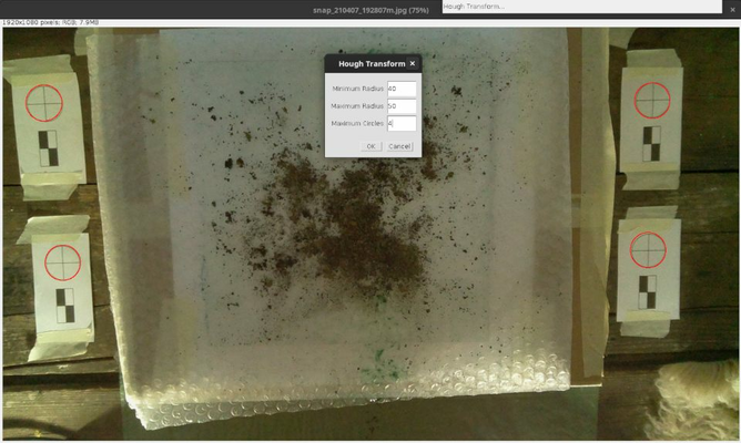 A circle-hough-transform plugin for ImageJ detects the circular markers. I should put them directly on the glass slide, so that if the slide or the box it rests on move, the image cropping can still be correctly performed.