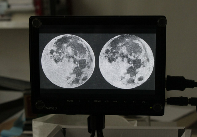 close-up through one lens. The tape is blocking the sight, in the installation the planar lenses will be glued to the front window of Reagenz. Also, stereo image is obviously not reproduced in this photo.