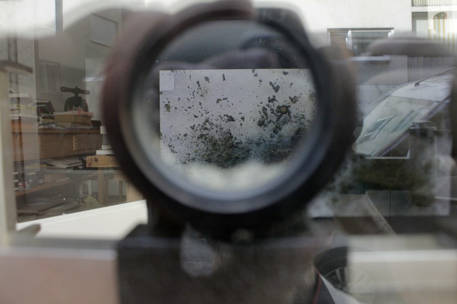 while still waiting for the large lenses, I got a beautiful stereo apparatus, where the lenses can be moved on a rail, and their distance can be adjusted. Here is another monocular shot through the thick window of Reagenz West. With the right adjustments, it is possible for passersby on the street to get good stereo vision.