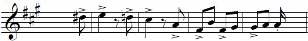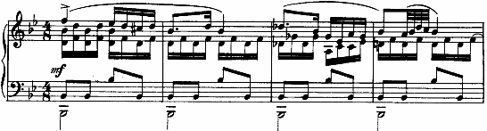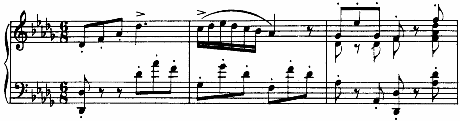 The opening melody (mm.1-4), together with the tonal orientation, texture and rhythm, recall at first the classical idioms (perhaps Mozart). However, the C# of bar 1 (that initially seems to be just a passage note), reappear in bar 3 as a D-flat, pulling the harmony to a G-flat major triad (against the tonic pedal). By bar 4, D-flat is discarded and the tonic triad reappears as if it had never been absent. This is an example of the typical Poulenc's humors, that can be used to move away from the prevalent classical style of the movement.