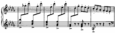 The antecedent-consequent phrases in bars 1-29 are not in the 4+4 bars classical form, but in a 3+4,2+2+2,4+1+2,4+5. In the last 4+5 section (mm.21-29), a D-flat major scale announces the return of the rondo theme. However the four measure passage at first does not achieve the tonic, because of a restart in a five measure phrase, which misses again the tonic. It concludes on the 2nd, and only after a two-octave pause it proceeds to the tonic. This is an example of the typical Poulenc “surprise”, and can be used to emphasize the humorist alteration of classic elements.