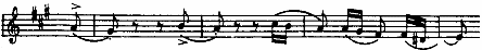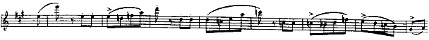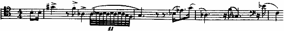 The next nine bars (mm.5-13) presents a theme (before bassoonVideo, then oboeVideo) that clearly lures to a military bugle-call "Taps"Audio. These were necessary based on a single overtone series. The articulation notated in the score should be interpreted having in mind the articulation of a bugle. Following this mindset, the “eleventuplets” (irregular group of eleven notes) can be seen as an imitation of the trilling techniques found in such instruments.