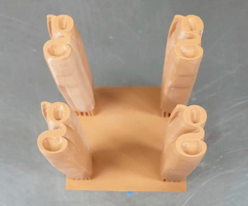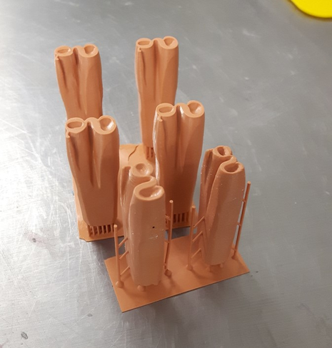 A number of 3D printing test builds were undertaken to identify the most suitable supports. Image to the left illustrates support pillars on the base and along the side of the punch. When deciding which structure to use the access to and selective removal of supports is important so as not to leave modern 3D printing witness marks on the reconstructions. The base supports were the least invasive and did not interfere with the surface texture on the sides of the punches.