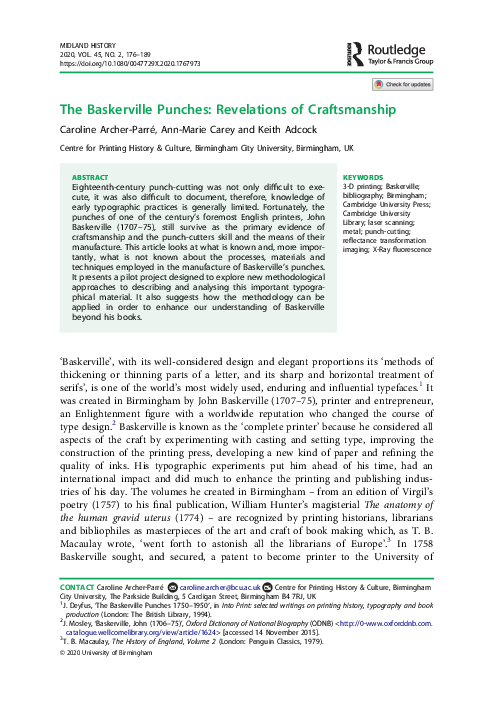 • Archer-Parré, Caroline, Ann-Marie Carey, and Keith Adcock “The Baskerville Punches: Revelation of craftsmanship” Conference - Cultures of the book: Science, technology and the spread of knowledge. International and interdisciplinary joint conference, University of Chieti-Pescara Italy 6-7th Nov 2019 (PDF of the Conference schedule)