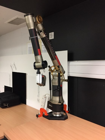 Image on the left the articulated arm in action being operated by Keith Adcock Senior Technologist at the School of Jewellery.