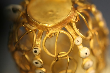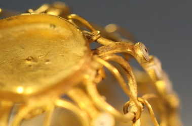 Getting up close: scoping the Pearl Dropper with the aid of a jewellers loupe, applying our experience as craftspeople to visually interrogate and deconstruct the artefact, surfaced many questions regarding its fabrication and construction techniques. Data was captured in photographs, sketch books and physical measurements. It was evident from the distorted wires, loose elements, fractured enamel and material loss that the artefact was extremely delicate and in a fragile condition.