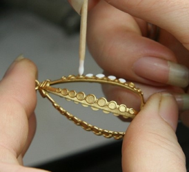 The enamelled surfaces on the original pearl dropper bulged beyond their metal rim settings, in recreating the same look, cold enamel had to be patiently applied and reapplied. The simple tool of a wooden cocktail stick proved incredibly useful in controlling the amount and thickness in applying  the enamel.