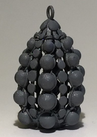 Wax: Utilising the School of Jewellery's in-house 3D wax printer (Invision 3D system) provided a proof of concept build. This type of 3D printing is a proven method in the jewellery industry to create sacrificial wax patterns for metal casting.  However the complex structure presented issues for this manufacturing route - geometrically the structure had many undercuts, fine wires and voids to work around, and the amount of spruing (channels to allow the flow of molten metal to reach every section of the structure) required to reach all areas before it cooled deemed problematic.