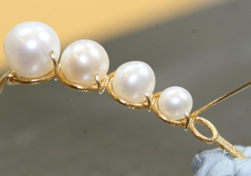 The attachment of pearls required several stages and a number of trials in copper wire to physically ‘figure out’ the ideal method of assembly. The most important aspect was the first twist, getting the tension right between wire and pearl, once the first pearl was attached the rest followed.