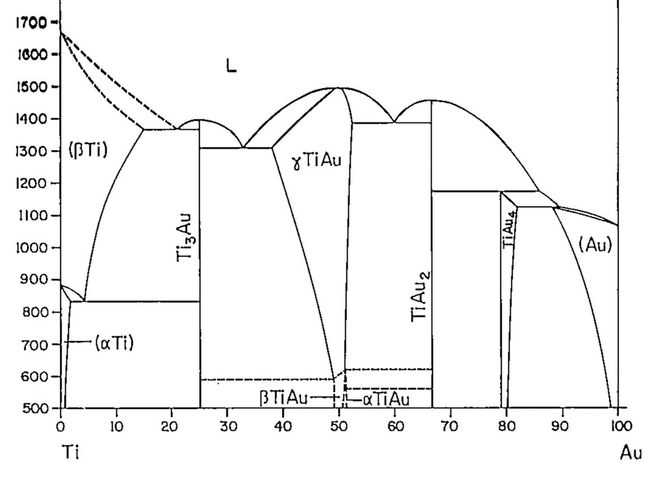 Secondly structures, the metallurgical phase diagram for Au and Ti illustrates the interaction of Au and Ti. Titanium can form up to four different intermetallic compounds, the properties of an intermetallic can differ considerably from their individual constituent and often do not inherit their parent’s properties. Theoretically each of the titanium atoms can combine with four gold atoms forming the intermetallic compound Au4Ti. This compound is capable of reacting with over 20% of the gold and in doing so locks up an unexpectedly high number of gold atoms. From a behaviour perspective the compounds do not disappear into the pure gold matrix; they form sizeable hard clumps with a different crystal structure from the highly ductile surrounding gold which is locally purer than before, because most of the titanium is now concentrated in the intermetallic compounds. From a crafts perspective the alloy is not extensively malleable but ‘interrupted’ by the intermetallic compounds resulting in unusual material behaviour.
